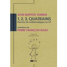 Une élève de CP découvre les mathématiques avec amusement en 43 poèmes illustrés de 23 dessins aux crayons de couleur. Après le succès rencontré par Un cursif ABC, 26 poèmes dans la caboche d'une élève de CP, l'écrivain Jean-Baptiste Verrier et l'artiste Pierre François Rault poursuivent leur déclaration d'amour à la alte de CP. Dans ce nouvel ouvrage sur le travail et la vie des écoliers, voici qu'après les lettres, la lecture et l'écriture, les deux auteurs placent les chiffres, les calculs, les problèmes et les figures géométriques sous les projecteurs de leur poésie. Ce recueil de 43 poèmes et 23 dessins aux crayons de couleur met en scène l'année d'une élève de CP à travers sa découverte des mathématiques. Le lecteur, quel que soit son âge, se retrouve petite souris dans l'imaginaire drôle et rock and roll de cette enfant de six ans. Confrontée aux maths , la fillette explore une quantité d'intuitions, s'autorise mille remarques et se pose cent questions, tantôt cocasses, tantôt philosophiques. Il y a des kilogrammes de gouaille et de malice dans sa voix. Parents et enseignants disposent avec cet ouvrage d'un objet familial et pédagogique pour transmettre à la fois le plaisir de la langue et le piment du jeu mathématique. 1, 2, 3, Quatrains offre du bon temps pour rire et sourire grâce aux mathématiques. Fidèles à leur habitude, Jean-Baptiste Verrier et Pierre François Rault s'en donnent à coeur joie pour faire l'éloge de tous les grands et petits moments vécus à l'école. Avec 1, 2, 3, Quatrains, ils adressent à tous les écoliers un message : Savourez chaque miette de votre scolarité. L'école, c'est fait pour apprendre bocou , s'amuser plein-plein et rêver grand . A rebours des discours défaitistes sur l'école, 1, 2, 3, Quatrains. Poèmes de mathématiques au CP rend heureux et confiant. Les atouts du recueil : Un recueil de poésie préfacé par une enseignante de CP. Un ouvrage utile aux parents et aux enseignants pour transmettre à la fois le plaisir de la langue et le piment du jeu mathématique. Pour ravir les enfants, l'imaginaire drôle et rock and roll d'une élève de six ans découvrant les maths . A rebours des discours défaitistes sur l'école, 1, 2, 3, Quatrains. Poèmes de mathématiques au CP rend heureux et confiant. Une déclaration d'amour pleine d'énergie à la alte de CP. Le second volet du succès rencontré par Un cursif ABC, 26 poèmes dans la caboche d'une élève de CP.