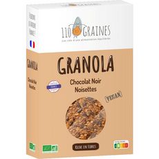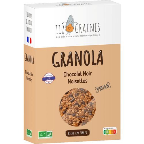 Ingrédients : Flocons d’avoine*, chocolat en poudre* (15%) (sucre de canne non raffiné*, cacao*) noisettes* (9%),FARINE DE BLÉ*, huile de colza*, graines de sarrasin*, graines de lin*, sirop d'agave*, sel. *Ingrédients issus de l’agriculture biologique.
