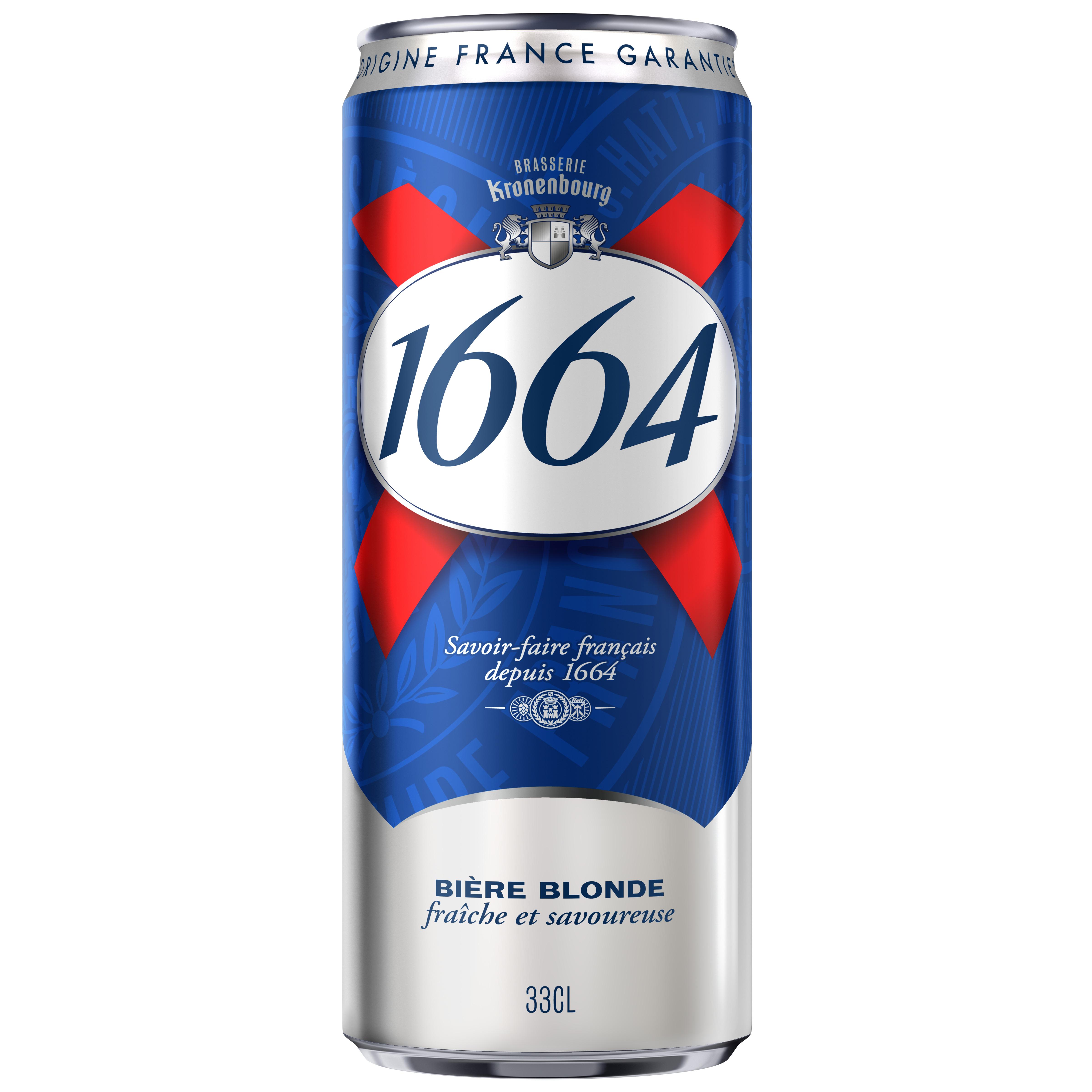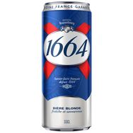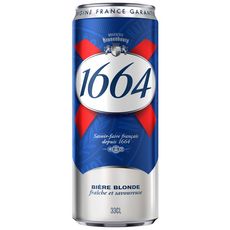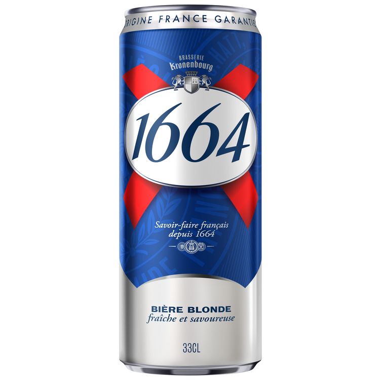 1664 Blonde, bière blonde emblématique brassée en Alsace, présente une robe jaune intense et une mousse dense. Elle offre des notes florales et un équilibre subtil entre finesse et amertume.