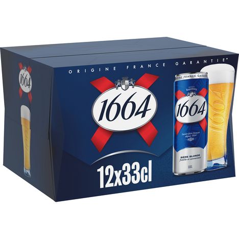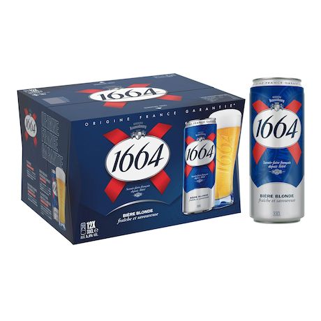 1664 Blonde, bière blonde emblématique brassée en Alsace, présente une robe jaune intense et une mousse dense. Elle offre des notes florales et un équilibre subtil entre finesse et amertume.