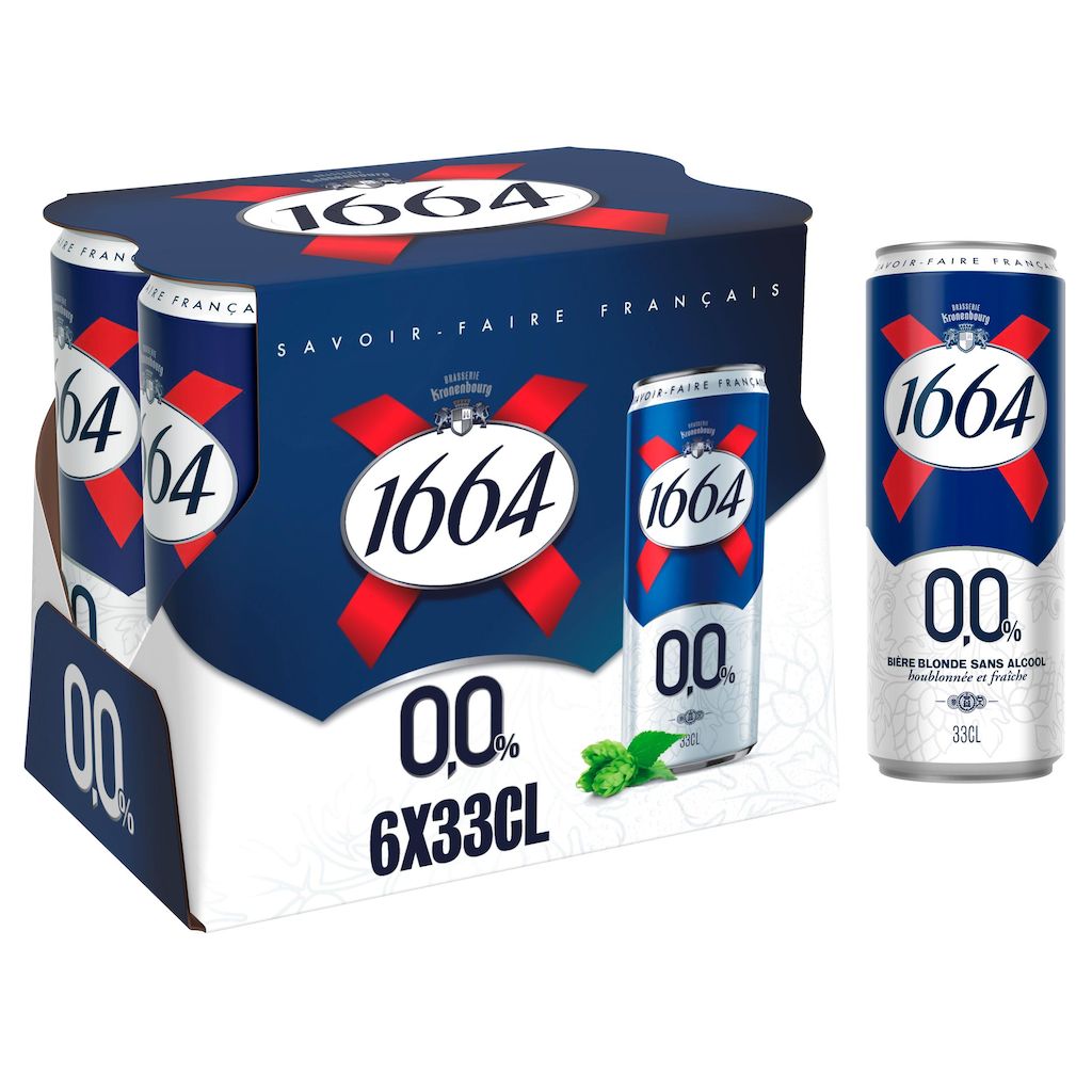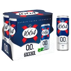 - 1664 0,0%, une bière blonde française, fraîche et houblonnée, avec 0.0% d'alcool. - Sans alcool et faible en caloris avec seulement 15kcal pour 100ml, la 1664 0.0% est idéale pour toutes les occasions et tous les moments de la journée. - C'est une bière à l'amertume généreuse et bien présente, avec un bon équilibre entre les saveurs sucrées et acides, une mousse dense, une petillance fine et une robe jaune dorée et brillante.Le houblon Strisselspalt, cultivé en France, qui lui confère son goût caractéristique, sa fine amertume et ses notes florales. - Elle se marie idéalement avec les plats légers, tels que du poisson cuisiné, des cocottes de légumes. - Bière brassée en Alsace, à Obernai, dans une brasserie française responsable. Qu'elles soient blondes, blanches, fruitées, avec du caractère ou même sans alcool, 1664 c'est un large choix de bières pour tous les goûts et toutes les occasions : au déjeuner, au dîner ou encore à l'apéritif ! Nous innovons sans cesse pour vous proposer de nouveaux goûts.