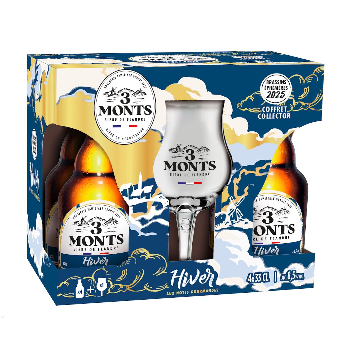 Ce coffret comprends 4 bouteilles 33cl de 3 Monts blonde et un verre collector à collectionner !