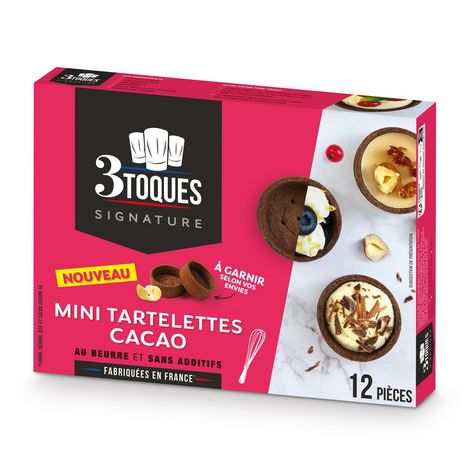 Avec les Prêts à garnir 3 TOQUES, le Chef c'est vous ! Réalisez facilement vos cocktails, plats et desserts. Les recettes pâtissières et gourmandes 3 TOQUES respectent l'environnement, le bien-être animal et la tradition. Les 9 tartelettes sablées au beurre 3 TOQUES : des fonds de tartelettes au beurre gourmands, à la texture sablée et croustillante. Fabriquées en France, les tartelettes sablées au beurre 3 TOQUES respectent la recette traditionnelle du sablé et sont sans conservateur, sans colorant et sans arôme. Déjà cuites, faciles et rapides à mettre en œuvre, elles se consomment chaudes ou froides. Idéales avec une crème pâtissière et les fruits de votre choix, avec une ganache au chocolat ou une garniture au citron, elles raviront vos invités, famille et amis.