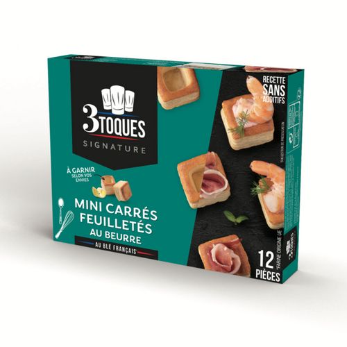 Avec les Prêts à garnir 3 TOQUES, le Chef c'est vous ! Réalisez facilement vos cocktails, plats et desserts. Les recettes pâtissières et gourmandes 3 TOQUES respectent l'environnement, le bien-être animal et la tradition. Le Mini carré feuilleté au beurre 3 TOQUES : une mini bouchée au beurre, légère, gourmande et au look moderne. Sa texture feuilletée croustillante, sa recette riche en beurre et son design contemporain en feront la star de vos cocktails. Fabriqué avec de la farine de blé français, le Mini carré feuilleté au beurre 3 TOQUES suit la méthode traditionnelle française du feuilletage qui voit le beurre être disposé entre les couches de pâte, garante d'un feuilleté léger et aéré. Déjà cuits, faciles et rapides à mettre en œuvre, les 12 Mini carrés feuilletés au beurre 3 TOQUES sont à réchauffer 3-4 minutes au four à 170° avant d'être garnis. Ils seront ainsi plus croustillants. Parfaits avec des garnitures crémeuses à base de viande, de poisson, de fruits de mer ou de légumes, ils laissent s'exprimer votre créativité pour le plaisir de vos invités, famille et amis !