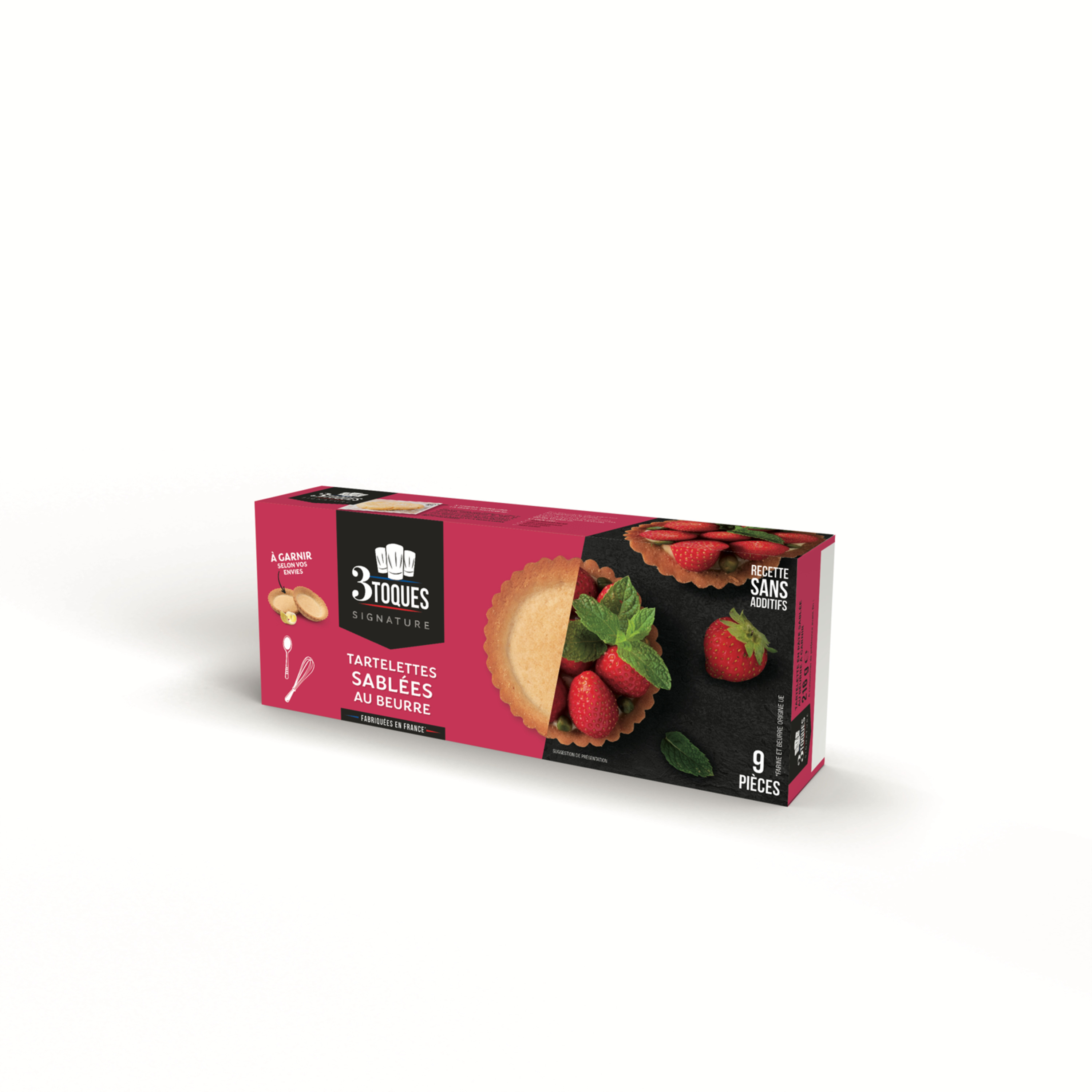 Avec les Prêts à garnir 3 TOQUES, le Chef c'est vous ! Réalisez facilement vos cocktails, plats et desserts. Les recettes pâtissières et gourmandes 3 TOQUES respectent l'environnement, le bien-être animal et la tradition. Les 9 tartelettes sablées au beurre 3 TOQUES : des fonds de tartelettes au beurre gourmands, à la texture sablée et croustillante. Fabriquées en France, les tartelettes sablées au beurre 3 TOQUES respectent la recette traditionnelle du sablé et sont sans conservateur, sans colorant et sans arôme. Déjà cuites, faciles et rapides à mettre en œuvre, elles se consomment chaudes ou froides. Idéales avec une crème pâtissière et les fruits de votre choix, avec une ganache au chocolat ou une garniture au citron, elles raviront vos invités, famille et amis.