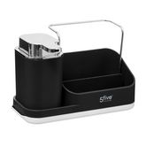 Sobriété de la forme, chic moderne du noir, un organisateur d'évier aussi élégant que pratique ! Composé d'un distributeur de savon liquide, de 2 bacs pour brosses et éponges et d'un receveur d'eau, il vous rendra mille services au quotidien. A associer aux égouttoirs couverts et vaisselle et au por
