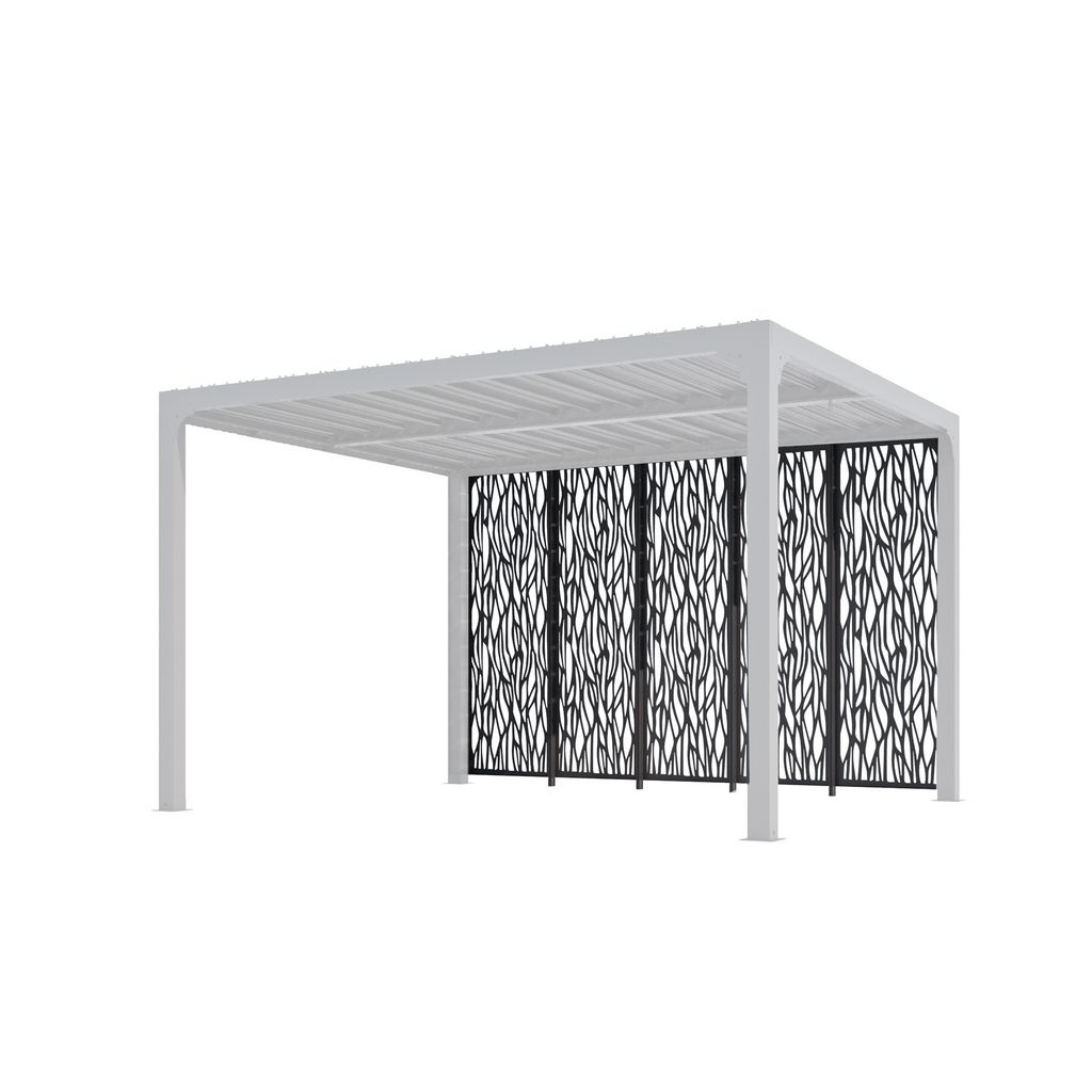 Indépendant, chaque panneau est composé d'une surface plane ajourée de formes végétales, design et contemporaines, serti sur un cadre de 2,50 m. On joint les panneaux à la pergola et à 4 poteaux centraux que l'on fixe au sol, ainsi on renforce la résistance de l'ensemble aux différentes pressions des vents et chocs divers. Composé d'un acier de 1 mm, très résistant, chaque panneau et poteau est thermolaqué pour réduire l'altération du temps et des intempéries.Simples à mettre en place sur les faces de 3,60 m de votre pergola, ils conviendront parfaitement à vos désirs de tranquilité et de quiétude face aux vents, au soleil et aux regards indiscrets.