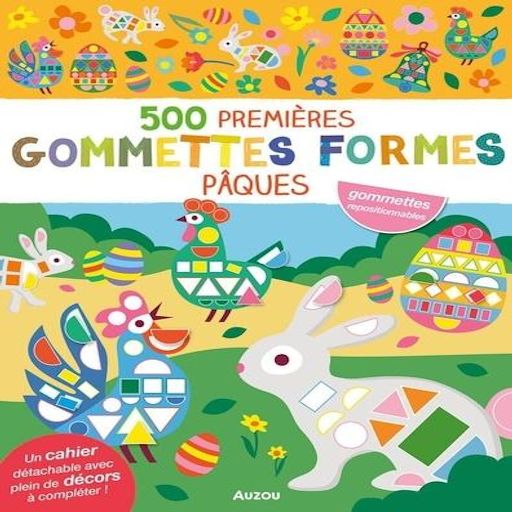 500 gommettes de formes géométriques sur le thème de Pâques ! Un cahier de 500 gommettes de formes géométrique, qui servent à compléter un cahier de décors détachables. Une activité parfaite pour favoriser l'éveil et la motricité des tout-petits ! Deux pages d'autocollants à coller partout viennent compléter l'activité.