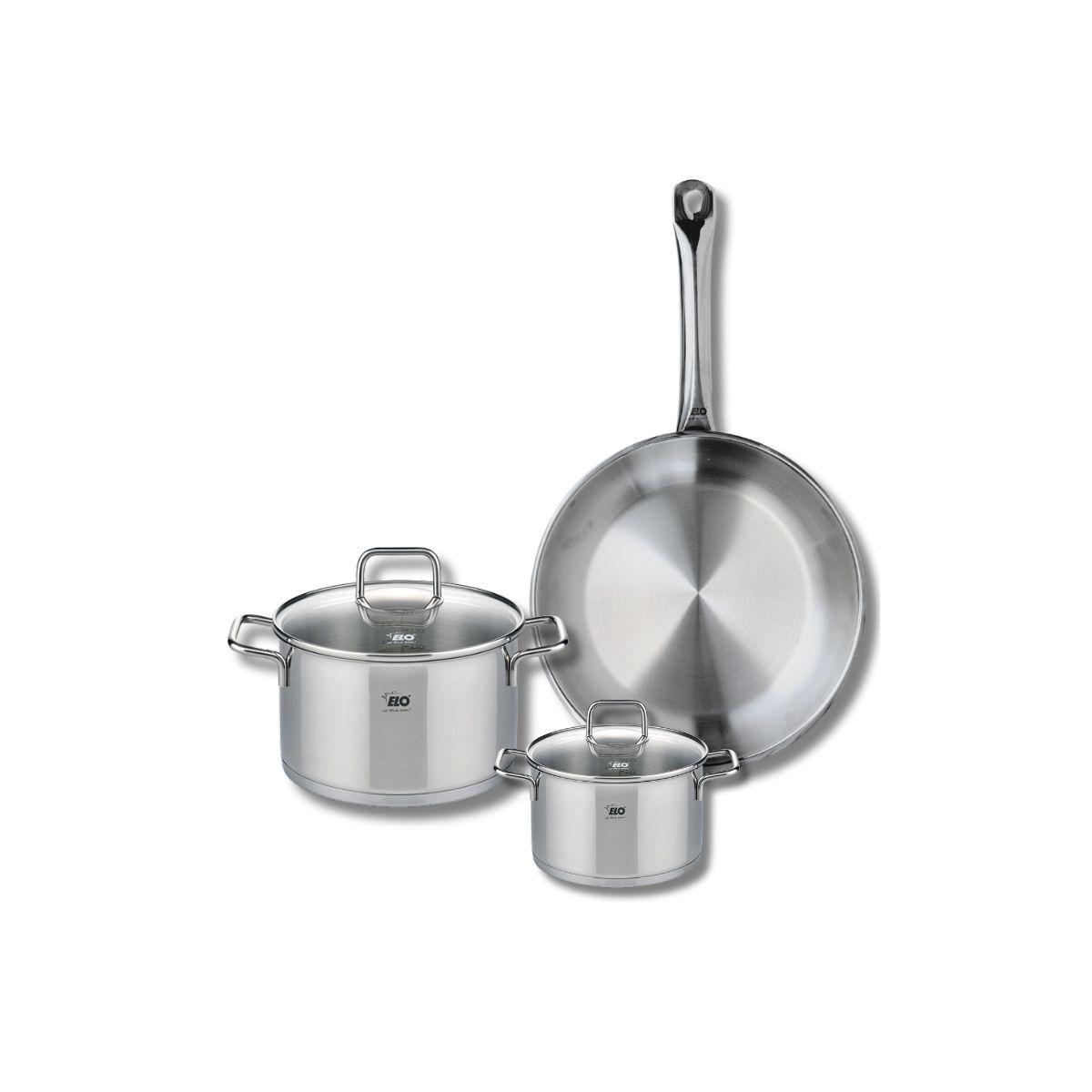 Découvrez l'ensemble de cuisine Elo Profi Citrin, comprenant une poêle de cuisson de 28 cm et deux faitouts de 14 et 20 cm. Conçus en inox de haute qualité, ces ustensiles sont parfaits pour tous types de cuisson, y compris l'induction, garantissant une distribution homogène de la chaleur pour des r