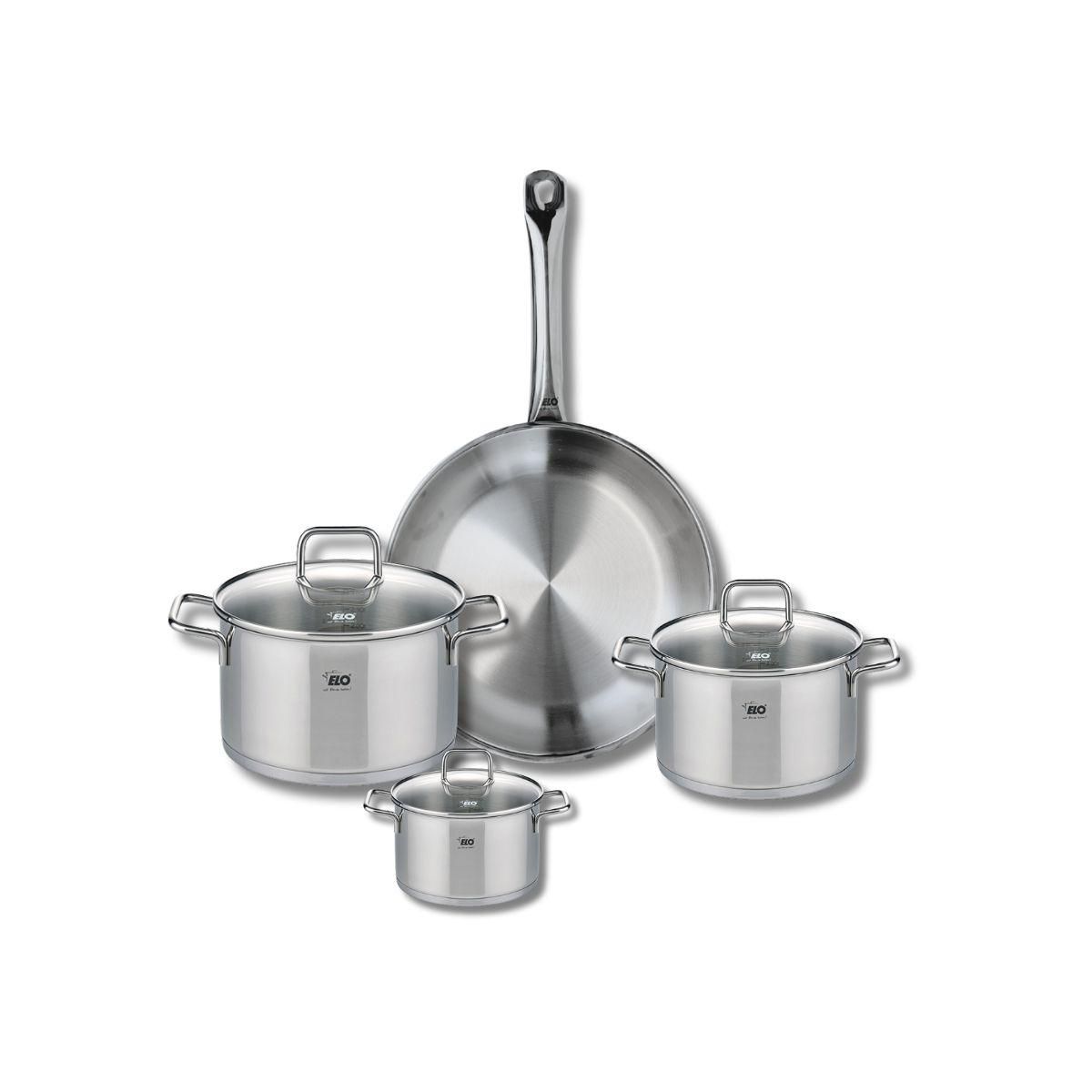 Découvrez l'ensemble de cuisine Elo Profi Citrin, une batterie de cuisine composée d'une poêle de cuisson de 28 cm et de trois faitouts de 12, 16 et 20 cm. Conçue en inox de haute qualité, cette collection allie performance et élégance. Chaque pièce est parfaite pour répondre à tous vos besoins culi