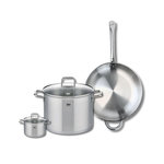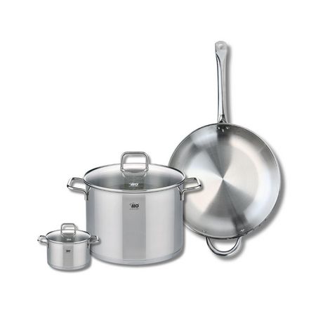Découvrez l'ensemble de cuisine Elo Profi Citrin, comprenant une poêle de cuisson de 32 cm et deux faitouts de 12 et 26 cm, tous en inox. Conçu pour répondre aux besoins des cuisiniers amateurs et professionnels, cet ensemble est idéal pour la préparation de délicieuses recettes au quotidien.La poêl