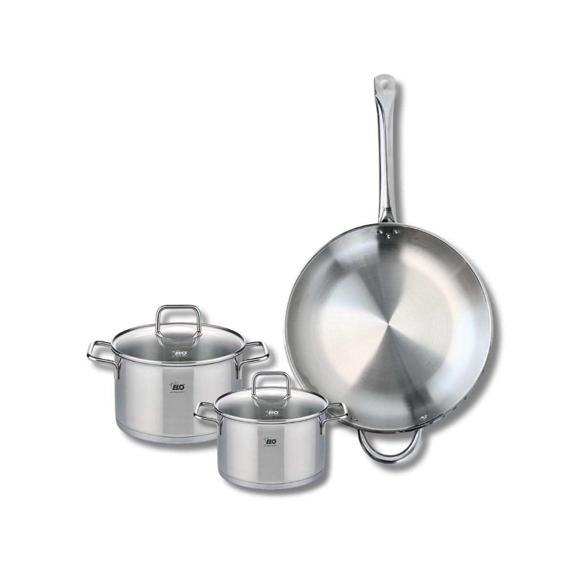 Découvrez l'ensemble de cuisine Elo Profi Citrin, un lot complet composé d'une poêle de cuisson de 32 cm et de deux faitouts de 16 et 20 cm, idéal pour tous vos besoins culinaires. Fabriqués en inox de haute qualité, ces ustensiles sont conçus pour résister à l'épreuve du temps, assurant robustesse
