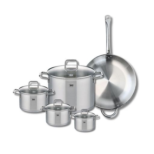 Découvrez notre batterie de cuisine en inox sans PFAS de la marque Allemande ELO, reconnue pour sa qualité. Ce set polyvalent comprend une poêle à frire de 32 cm, et 4 faitouts de 12 cm, 14 cm, 16 cm et 26 cm de diamètre. L'inox est un matériau facile à entretenir, robuste, résistant à la corrosion et esthétique. Ces ustensiles sont compatibles avec tous les types de feux dont l'induction, et passent même au four (sauf les couvercles).