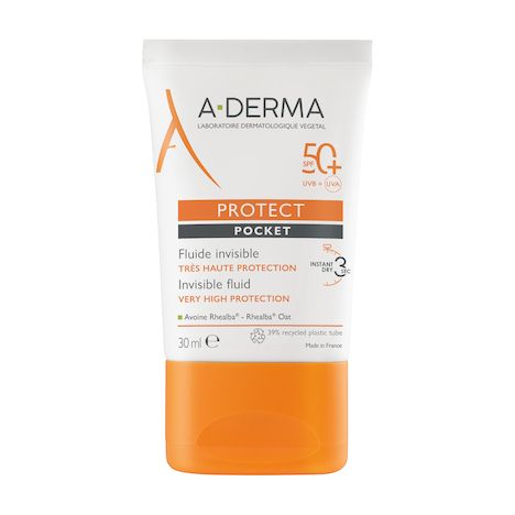 Toujours à portée de main, A-DERMA PROTECT POCKET — SPF 50+ protège les peaux fragiles mixtes à grasses face au soleil et à la pollution. Son tube pratique au format poche permet de l'emporter partout (ville, plein air...), quelle que soit son activité (sportive ou farniente). Le duo de poudres, intégrées à sa formule, absorbe instantanément le sébum présent à la surface de la peau. Une technologie "Instant Dry 3 secondes" ("séchage instantané" en trois secondes) qui ne laisse pas de traces blanches ni de film gras sur la peau. PROTECT POCKET Fluide solaire visage invisible SPF50+ est résistant à l’eau, renforce et sécurise les peaux fragiles face aux dommages causés par le soleil grâce, notamment, au Barriestolide® issu de l’Huile de Plantules d’Avoine Rhealba®. Une innovation solaire brevetée* née de sept années de recherche. Avec sa sélection rigoureuse et sa concentration optimisée de filtres et d’ingrédients, il est la meilleure réponse au besoin de protection solaire quotidienne. Chacun de nos filtres a été évalué par des Laboratoires Indépendants, qui ont démontré que nos filtres PROTECT n’avaient pas d’impact sur des organismes représentatifs du milieu marin, notamment sur les coraux .