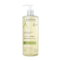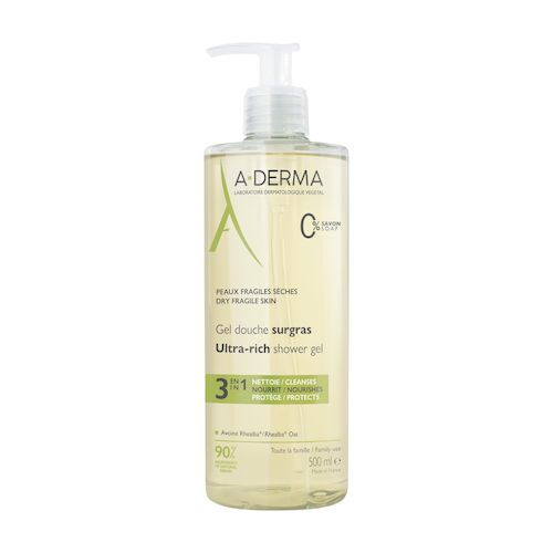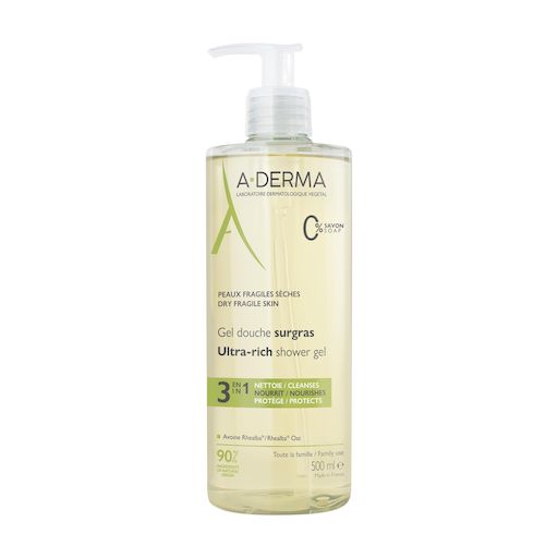 Le gel douche surgras d'A-DERMA est enrichi en Extrait de Plantules d’Avoine Rhealba® issue de l'agriculture Biologique et en émollients d'origine naturelle. Sous la douche, ce soin lavant protecteur visage et corps nettoie, nourrit et protège la peau fragile de toute la famille. Composé à 90% d'ingrédients d'origine naturelle, il tire son efficacité et ses vertus apaisantes et relipidantes du Clean Care Complex™, association d’une base lavante douce et d’un agent compensateur. Cette innovation dermatologique permet de nettoyer la peau sèche sans l’agresser ni la dessécher davantage. Biodégradable*, sans savon, sa formule à l’Extrait de Plantules d’Avoine Rhealba® apaisante adoucit la peau. Au sortir de la douche, la peau sèche est nourrie, apaisée et protégée.