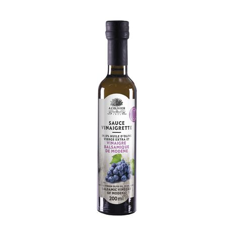 Huile d'olive vierge extra 59.5%, vinaigre de Balsamique de Modène 40% (vinaigre de vin, moût de raisin cuit), sel. Contient des SULFITES.