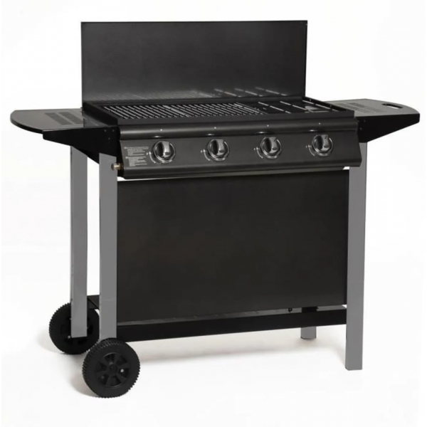 En savoir +Barbecue a gaz 4 bruleurs avec capot de protection - Surface de cuisson L76 x l41 cm - 2/3 grill et 1/3 plancha - Allumage piezo intégré - 2 tablettes latérales - 1 jupe - 1 tablette basse - 2 roues