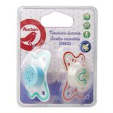 Lot de 2 sucettes phosphorescentes pour les bébés de plus de 18 mois, son embout réversible s’adapte à la bouche de bébé quelle que soit sa position. Le silicone est une matière résistante et sans odeur.