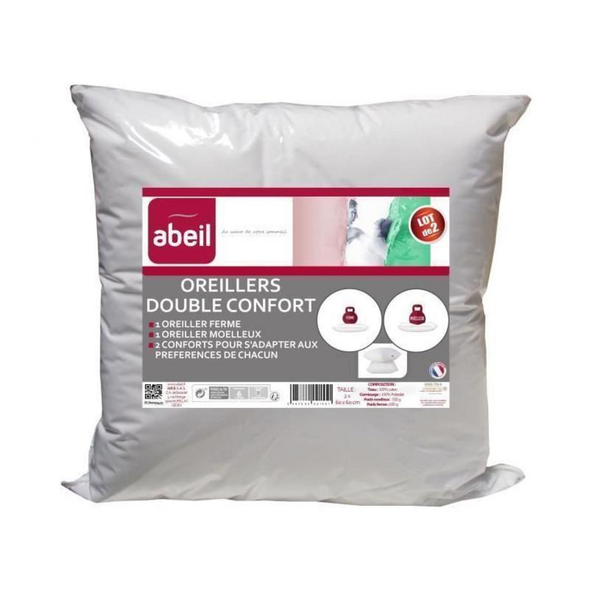 ABEIL Lot de 2 oreillers DOUBLE CONFORT (1 oreiller ferme + 1 oreiller moelleux) - Enveloppe: 100% Coton - Garnissage: 100% Polyester - Poids de garnissage : oreiller moelleux 550g et oreiller ferme 650g - Lavable en machine a 40°C - Certification oeKO-TEX - Fabrication Française