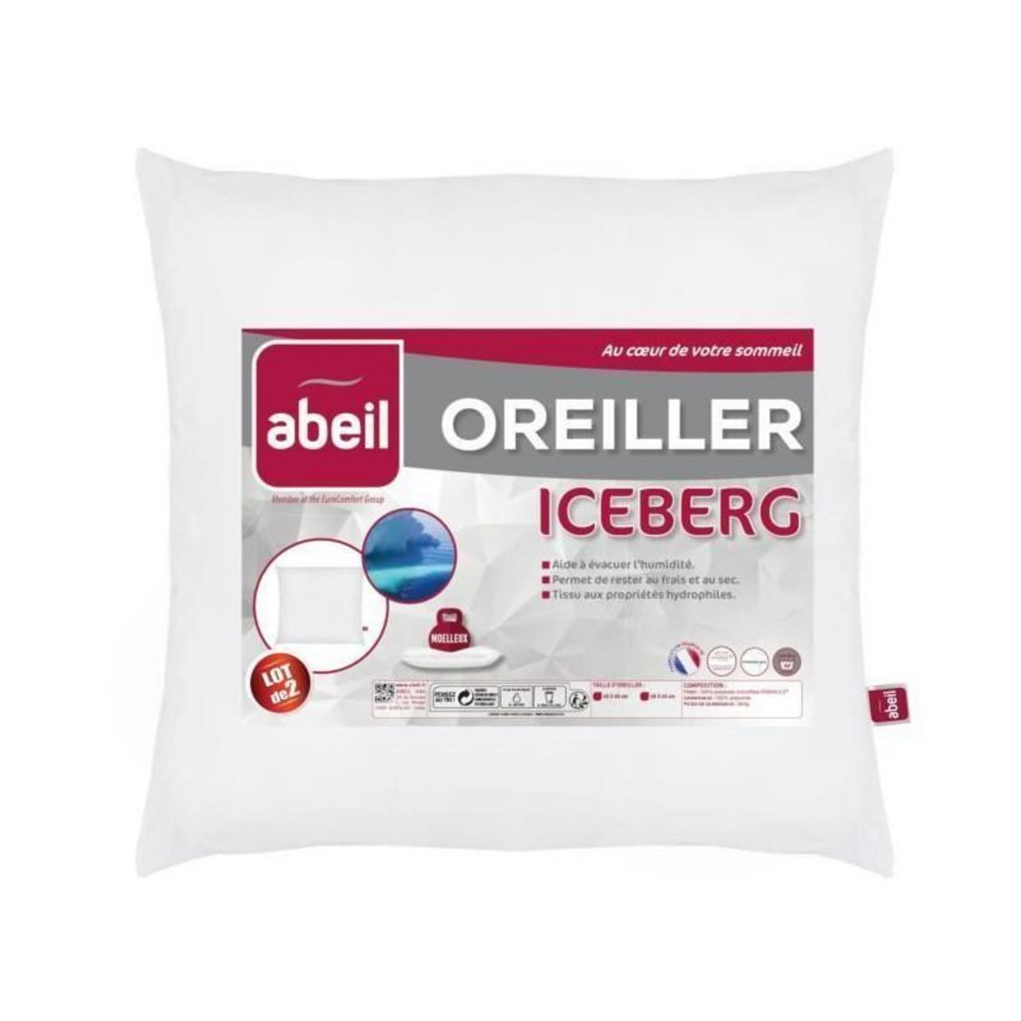 ABEIL Lot de 2 Oreillers moelleux ICEBERG 60x60cm - Enveloppe Microfibre 100% Polyester traité FERAN ICE® (favorise la circulation de l'air et contrôle la température pour un effet rafraichissant, ce traitement antistatique aide a évacuer l'humidité et la transpiration) - Garnissage : 100% Polyester 560g - Effet Fraîcheur - Lavable en machine a 40°C - Fabrication Française.