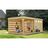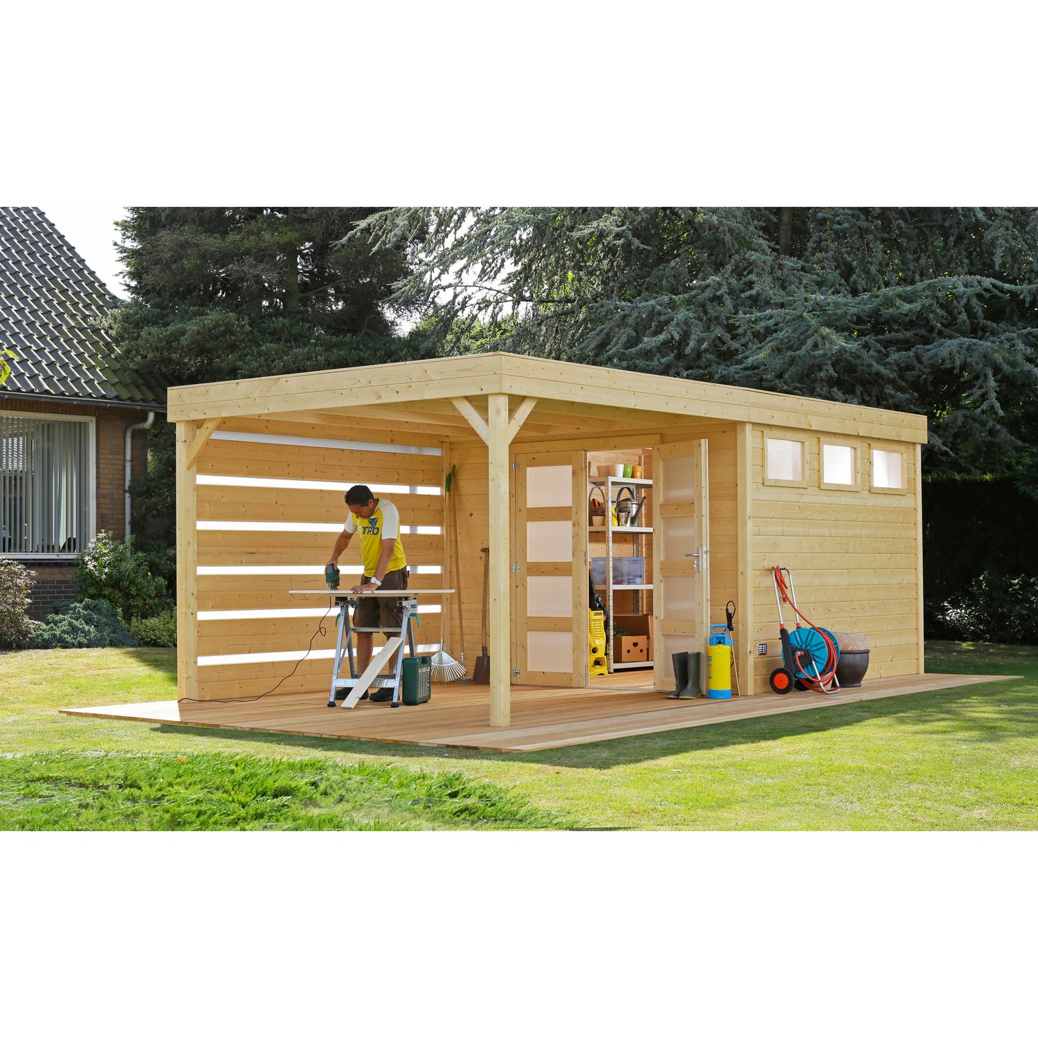 L'abri de bois Hawick offre un bel espace clos et discret ainsi qu'une terrasse d'une superficie de 9,29 m². Vous pouvez laisser aller votre imagination pour en faire un coin détente ou un atelier. Le tout est donc constitué d'un petit chalet de 9,3 m² et d'une pergola en parois 28mm. L'abri est en madriers 28mm et bois brut à lasurer et certifié bois PEFC. Il est composé d'une double porte vitrée avec serrure à barillet et de trois fenêtres sur le coté. Le toit plat lui donne un côté très moderne. Le seuil de la porte a été rabaissé pour un meilleur accès. Dimensions : intérieur 2,94m x 2,94m, hauteur 2,30m.
