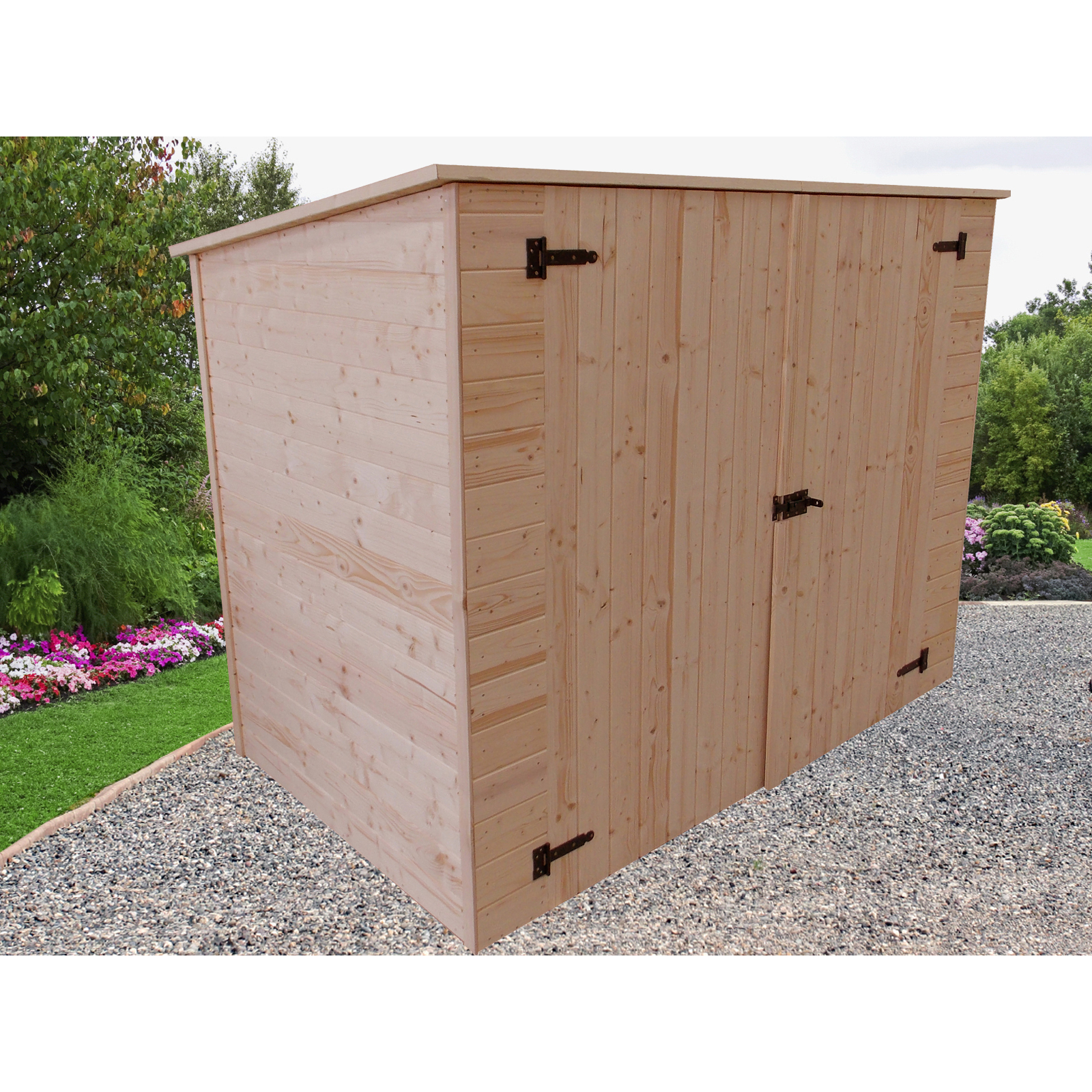 Abri mural Jaco bois massif 16mm, idéal pour ranger vos vélos, scooters, motos, mobilier de jardin, gros volume. Toiture en feutre bitumée. Grandes dimensions extérieures : L 220 x l 125 x H 162 cm.