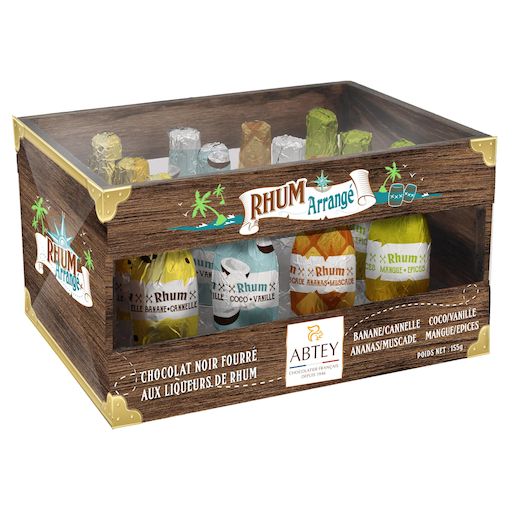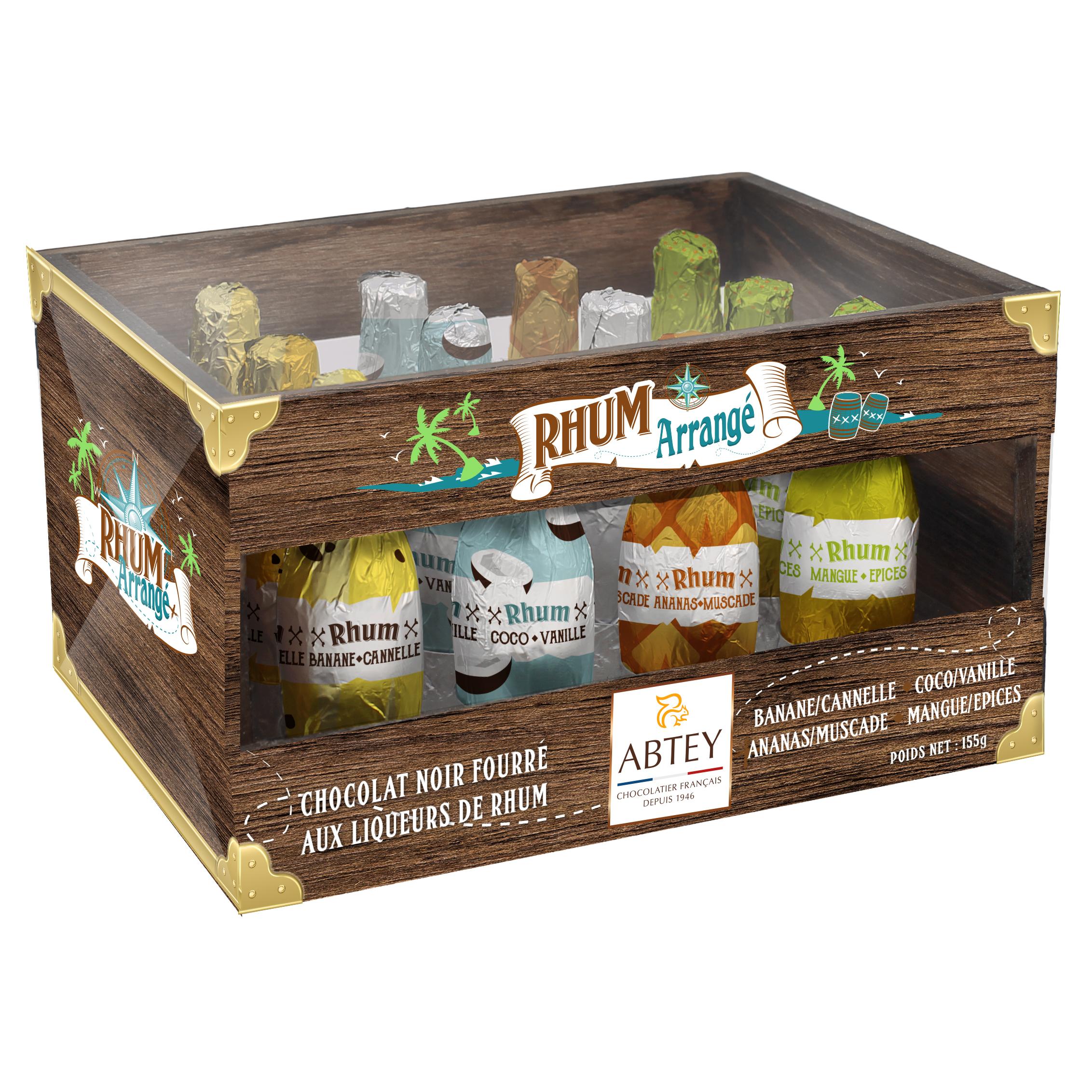 bouteilles en chocolat noir fourré à la liqueur à base de rhum arrangés (Banane Cannelle, Coco-Vanille, Mangue Epices Chaï, Ananas Muscade)