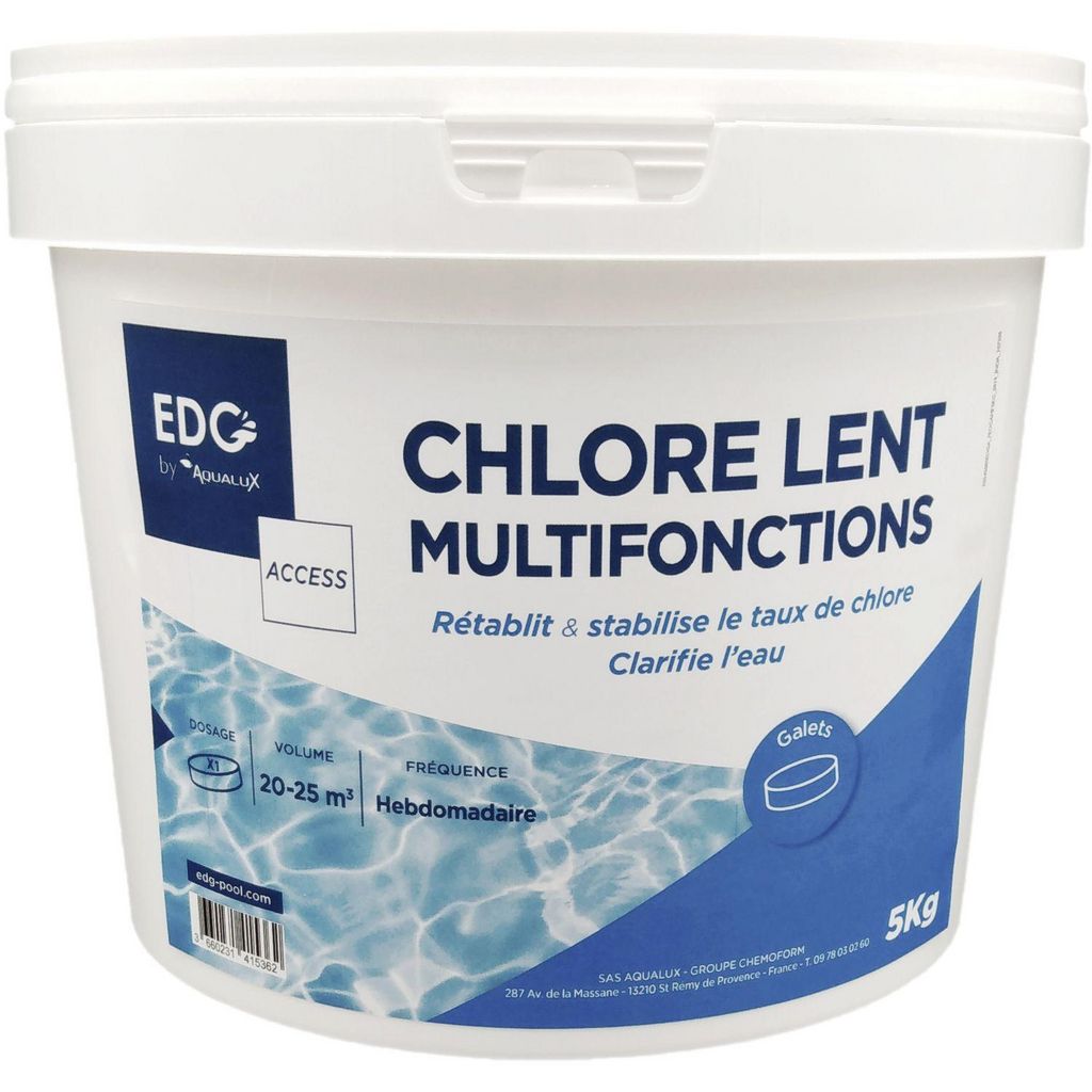 Sous forme de galets, ce chlore lent se dissolve dans l'eau pour rétablir le taux de chlore de votre piscine tout en permettant un entretien complet. C'est un produit "tout en un" qui désinfecte, stabilise le chlore, empêche la formation d'algues, la floculation et la formation de calcaire