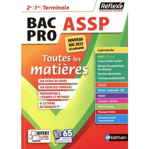 Toutes les matières pour préparer et réussir ton Bac Pro ASSP ! Conformes aux nouveaux programmes (à partir de la session 2025), toutes les épreuves du Bac Pro ASSP traitées dans un ouvrage clair et synthétique : Le cours complet : pour approfondir et comprendre les notions de chaque discipline. Des exercices et leurs corrigés pour t'entraîner pour les contrôles et pour le Bac. Des méthodes pour le Bac : la présentation des épreuves du Bac Pro et les conseils méthodologiques. Livre en ligne INCLUS : pour l'achat de cet ouvrage, consulte l'intégralité de ton livre sur de nombreux supports (PC/Mac, Tablettes et Smartphones...). En savoir plus sur www. nathan. fr/livre-en-ligne ET EN PLUS. Un dossier Je gère mon BAC : les méthodes de l'examen, les enjeux du BAC, et des conseils pour l'admission Parcoursup.