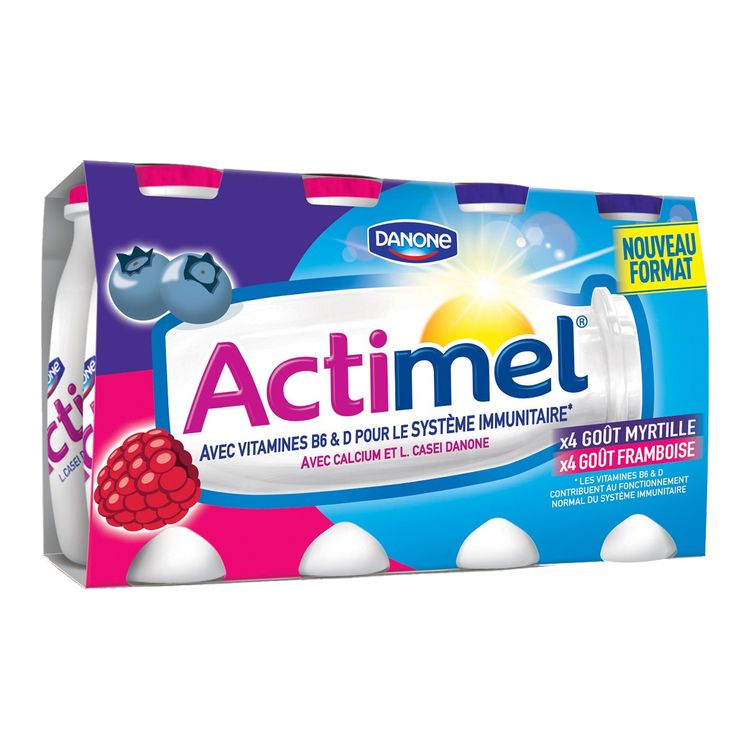 Actimel : des vitamines B6 & D qui contribuent au fonctionnement normal du système immunitaire. Et toujours du L. Casei Danone ! Variez les plaisirs chaque matin avec Actimel Goût Framboise ou Goût Myrtille. lait fermenté à boire, sucré, aromatisé et enrichi en vitamines B6 et D