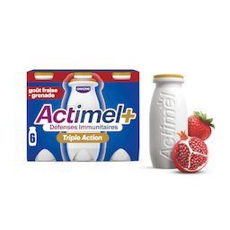 Découvrez Actimel Triple Action, la gamme la plus complète d'Actimel. Actimel Triple Action, c'est : •100% des apports quotidiens en vitamine D pour soutenir vos défenses immunitaires* •Une formule source de vitamine C aux propriétés anti-oxydantes** •Un enrichissement en magnésium qui contribue à réduire la fatigue. Un combo délicieux, alliant la douceur de la fraise et la fraîcheur de la grenade. Actimel, votre petit geste immunité* des matinées vitaminées !