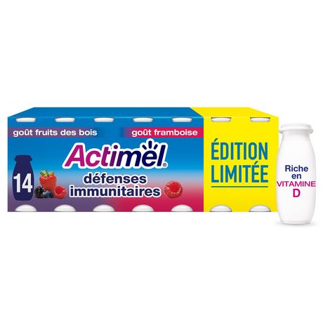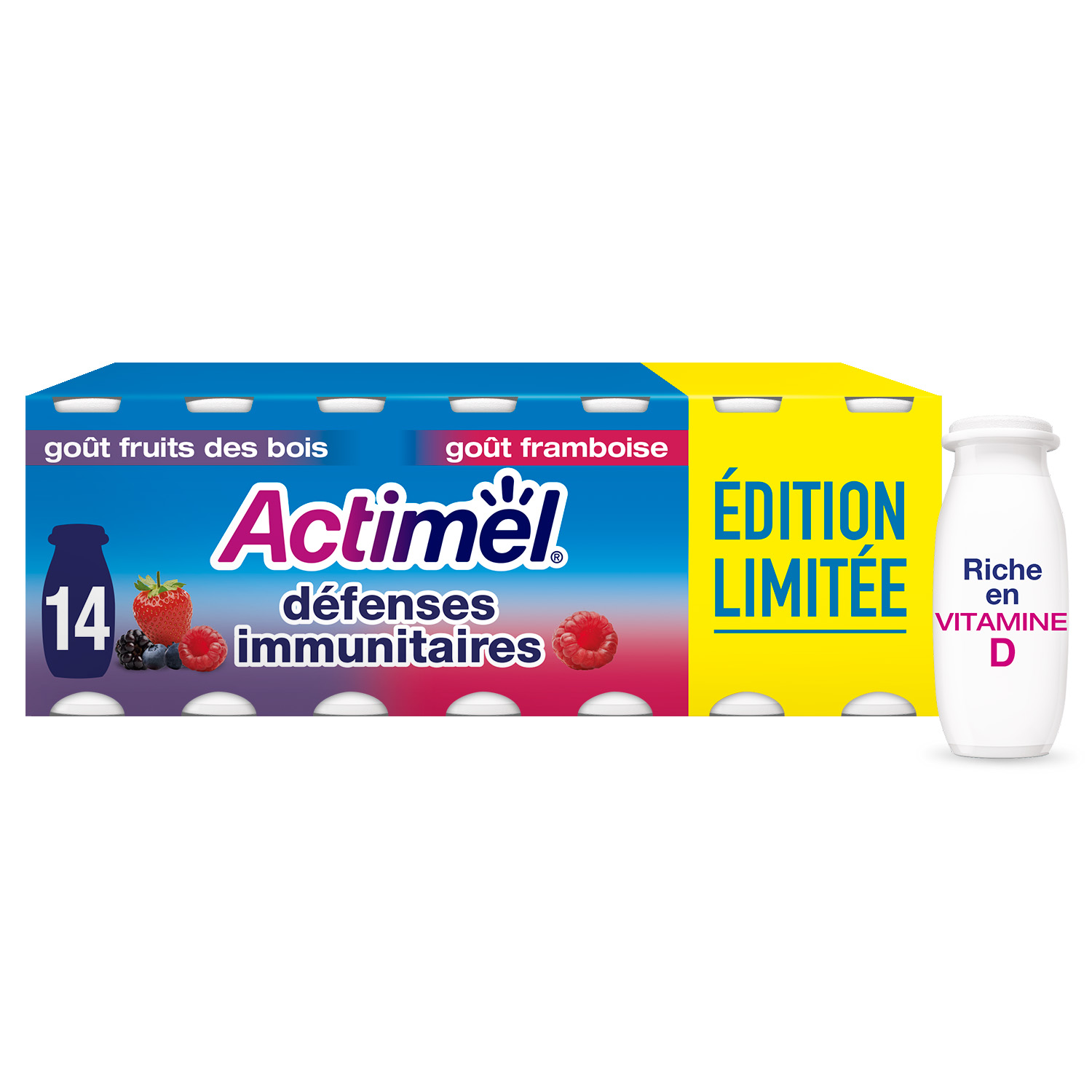 Actimel à boire c'est des produits laitiers aromatisés fruits des bois et framboise (à base d'arômes naturels), riches en vitamine D qui contribue au fonctionnement normal du système immunitaire. Cette recette goût fruits des bois, et goût framboise est source de calcium, vitamine B6 et protéines! Il renferme un tas de bonnes choses dont des milliards de ferments L.casei Danone d'origine naturelle* ainsi que les ferments du yaourt. Actimel ce sont des bouteilles et des emballages en carton recyclables! Son format pratique est un allié de taille tout au long de la journée, parfait pour le petit-déjeuner comme pour vos pauses! *Comme tous les ferments du marché