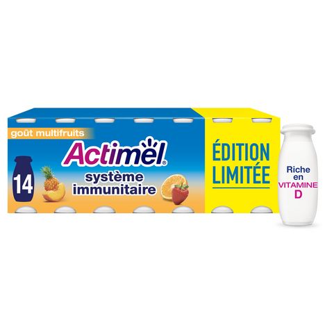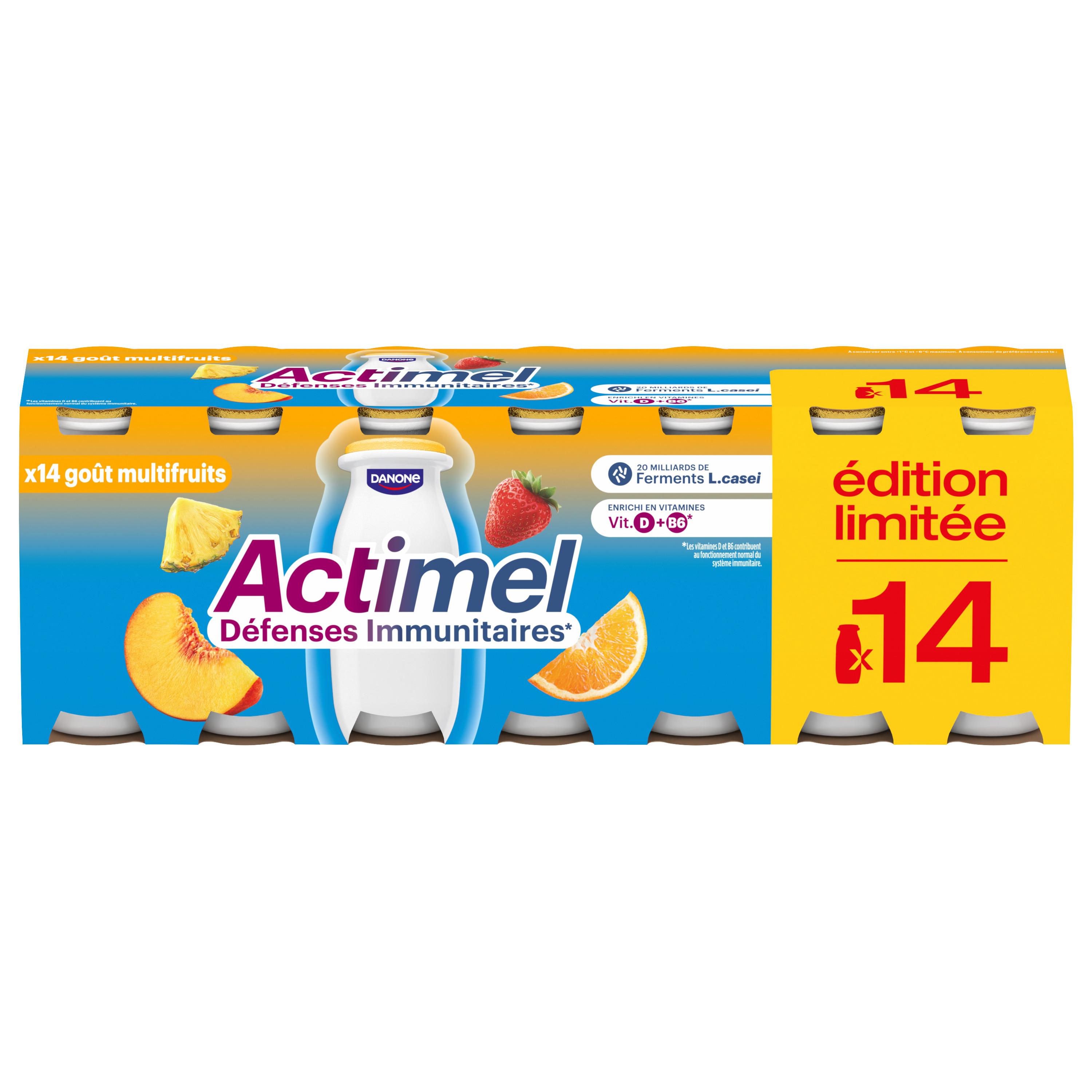 Actimel à boire est un produit laitier aromatisé multifruits (à base d'arômes naturels) riche en vitamine D qui contribue au fonctionnement normal du système immunitaire. Cette recette goût multifruits est source de calcium, vitamine B6 et protéines! Elle renferme un tas de bonnes choses dont des milliards de ferments L.casei Danone d'origine naturelle* ainsi que les ferments du yaourt. Actimel c'est des bouteilles et des emballages en carton recyclables! Son format pratique est un allié de taille tout au long de la journée, parfait pour le petit-déjeuner comme pour vos pauses! *Comme tous les ferments du marché