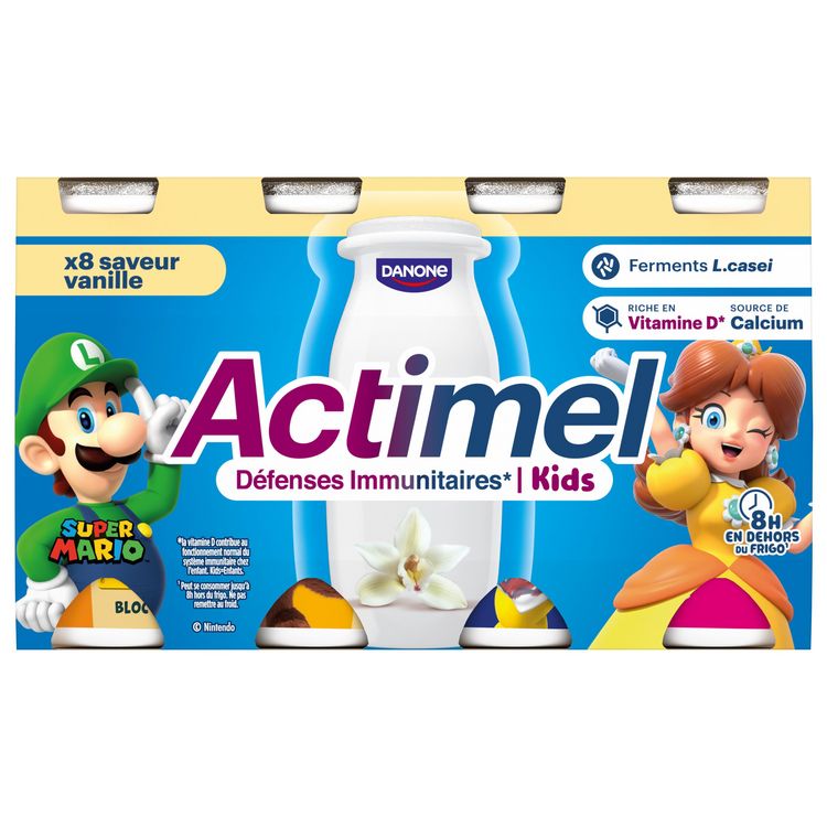 Actimel saveur Vanille, le petit geste immunité* des bonnes journées ! Lorsque tu bois ton Actimel, la vitamine D passe dans ton corps pour atteindre tes cellules immunitaires et les aider à bien fonctionner*. Il est source de calcium et renferme un tas de bonnes choses dont des milliards de ferments L.casei exclusifs d'origine naturelle** ainsi que les ferments du yaourt. Son format pratique est un allié de taille tout au long de ta journée car il se garde jusqu'à 8h en dehors du frigo ! *La vitamine D contribue au fonctionnement normal du système immunitaire chez l'enfant. **Comme tous les ferments du marché.