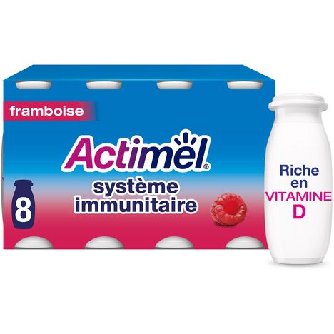 Lait fermenté à boire, sucré, aromatisé et enrichi en vitamines B6 et D Actimel Framboise x8 avec toujours 10 milliards de ferments L.Casei et enrichie en vitamines D et B6 pour le système immunitaire