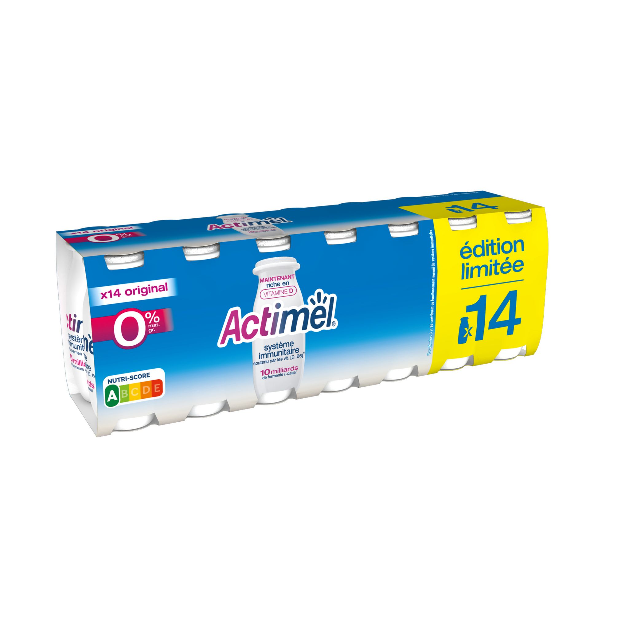 Actimel à boire nature 0% est un produit laitier avec 0% de matières grasses, et au goût sucré (grâce aux édulcorants). Il est riche en vitamine D qui contribue au fonctionnement normal du système immunitaire. Cette recette 0% est source de calcium, vitamine B6 et protéines! Il renferme un tas de bonnes choses dont des milliards de ferments L.casei Danone d'origine naturelle* ainsi que les ferments du yaourt. Actimel 0% ce sont des bouteilles et des emballages en carton recyclables! Son format pratique est un allié de taille tout au long de la journée, parfait pour le petit-déjeuner comme pour vos pauses! *Comme tous les ferments du marché