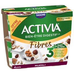 ACTIVIA Céréales Muesli c'est l'alliance de l'onctuosité ACTIVIA et d'un mélange savoureux de muesli avec de délicieuses céréales (blé, avoine), noisettes, amandes, noix et raisins secs. Véritable allié du petit-déjeuner et des fins de repas, cet Activia source de fibres est à base de bon lait et de 5 ferments dont des milliards de probiotiques*! .Une recette gourmande source de fibres qui contribue à votre apport quotidien recommandé en fibres**. *Activia contient les ferments du yaourt : les probiotiques. Ils vous aident à la digestion du lactose de votre Activia en cas de difficulté à le digérer ** Apport quotidien recommandé = 30g (ANSES 2016)
