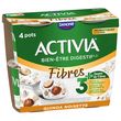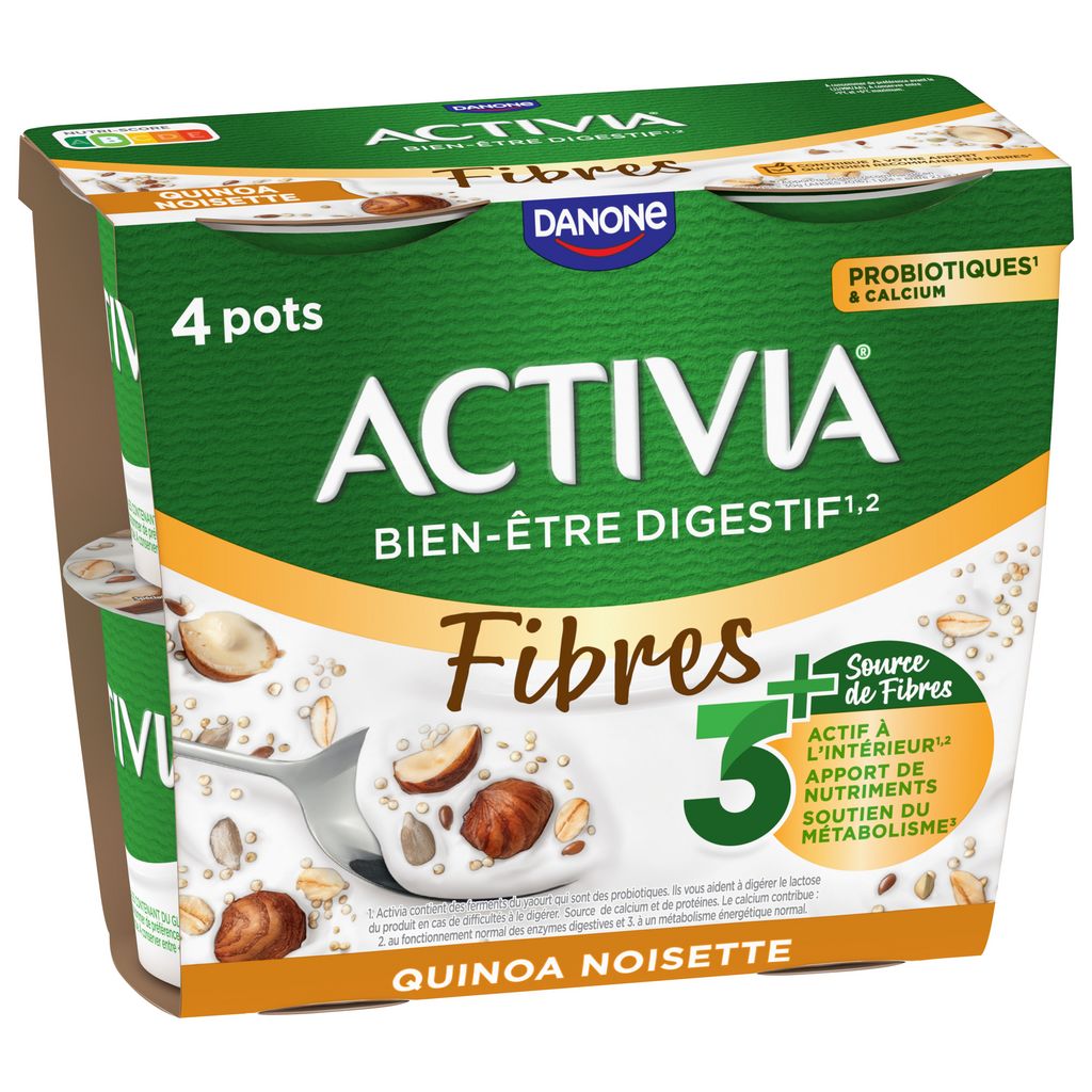 ACTIVIA Céréales Quinoa Noisette c'est l'alliance de l'onctuosité ACTIVIA et d'un mélange savoureux de muesli avec de délicieuses céréales quinoa et noisette. Véritable allié du petit-déjeuner et des fins de repas, cet Activia source de fibres est à base de bon lait et de 5 ferments dont des milliards de probiotiques*! .Une recette gourmande source de fibres qui contribue à votre apport quotidien recommandé en fibres**. *Activia contient les ferments du yaourt : les probiotiques. Ils vous aident à la digestion du lactose de votre Activia en cas de difficulté à le digérer ** Apport quotidien recommandé = 30g (ANSES 2016)