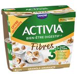 ACTIVIA Céréales Granola Amarante c'est l'alliance de l'onctuosité ACTIVIA et d'un mélange savoureux de délicieuses céréales. Véritable allié du petit-déjeuner et des fins de repas, cet Activia source de fibres est à base de bon lait et de 5 ferments dont des milliards de probiotiques*! .Une recette gourmande source de fibres qui contribue à votre apport quotidien recommandé en fibres**. *Activia contient les ferments du yaourt : les probiotiques. Ils vous aident à la digestion du lactose de votre Activia en cas de difficulté à le digérer ** Apport quotidien recommandé = 30g (ANSES 2016)