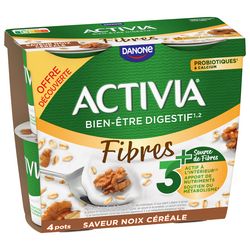 ACTIVIA Céréales saveur Noix c'est l'alliance de l'onctuosité ACTIVIA, d'un mélange savoureux de céréales et d'une délicieuse saveur de noix. Véritable allié du petit-déjeuner et des fins de repas, cet Activia source de fibres est à base de bon lait et de 5 ferments dont des milliards de probiotiques*! .Une recette gourmande source de fibres qui contribue à votre apport quotidien recommandé en fibres**. *Activia contient les ferments du yaourt : les probiotiques. Ils vous aident à la digestion du lactose de votre Activia en cas de difficulté à le digérer ** Apport quotidien recommandé = 30g (ANSES 2016)