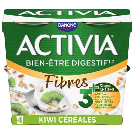 Activia céréales et fruits kiwi au bifidus, c'est une recette avec de délicieux morceaux de fruits mélangés à une texture gourmande aux céréales. Une texture onctueuse aux céréales mélangée à de vrais morceaux de kiwi. Source de fibres, Activia céréales contribue à votre apport quotidien recommandé* Activia Céréales & Fruits contient du calcium** et des probiotiques actifs***, bons pour votre bien-être digestif*. *Apport quotidien recommandé = 30g (ANSES 2016) **Le calcium contribue au fonctionnement normal des enzymes digestives. ***Activia contient les ferments du yaourt : les probiotiques. Ils vous aident à la digestion du lactose de votre Activia en cas de difficulté à le digérer