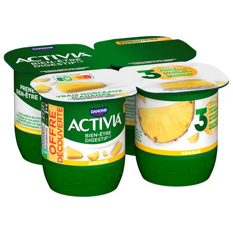 ACTIVIA yaourt aux fruits à l'ananas, c'est toute l'onctuosité d'ACTIVIA associée à de bons morceaux d'ananas. Cet Activia contient des ingrédients 100% d'origine naturelle, du bon lait entier français*, du bifidus et des milliards de ferments dont les probiotiques**. Une spécialité laitière conçue dans notre laiterie de Villecomtal-sur-Arros (32)! *Ajout de lait écrémé concentré ou en poudre (Origine: UE) **Activia contient les ferments du yaourt : les probiotiques. Ils vous aident à la digestion du lactose de votre Activia en cas de difficulté à le digérer.