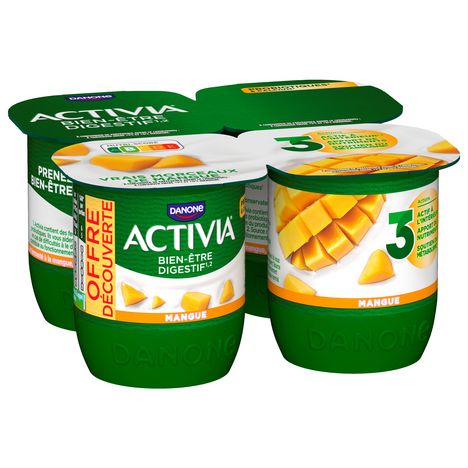 ACTIVIA yaourt aux fruits à la mangue, c'est toute l'onctuosité d'ACTIVIA associée à de bons morceaux de mangue. Cet Activia contient des ingrédients 100% d'origine naturelle, du bon lait entier français*, du bifidus et des milliards de ferments dont les probiotiques**. Une spécialité laitière conçue dans notre laiterie de Villecomtal-sur-Arros (32)! *Ajout de lait écrémé concentré ou en poudre (Origine: UE) **Activia contient les ferments du yaourt : les probiotiques. Ils vous aident à la digestion du lactose de votre Activia en cas de difficulté à le digérer.