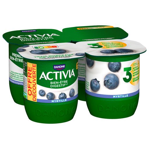 ACTIVIA yaourt aux fruits à la myrtille, c'est toute l'onctuosité d'ACTIVIA associée à de bons morceaux de myrtille. Cet Activia contient des ingrédients 100% d'origine naturelle, du bon lait entier français*, du bifidus et des milliards de ferments dont les probiotiques**. Une spécialité laitière conçue dans notre laiterie de Villecomtal-sur-Arros (32)! *Ajout de lait écrémé concentré ou en poudre (Origine: UE) **Activia contient les ferments du yaourt : les probiotiques. Ils vous aident à la digestion du lactose de votre Activia en cas de difficulté à le digérer.