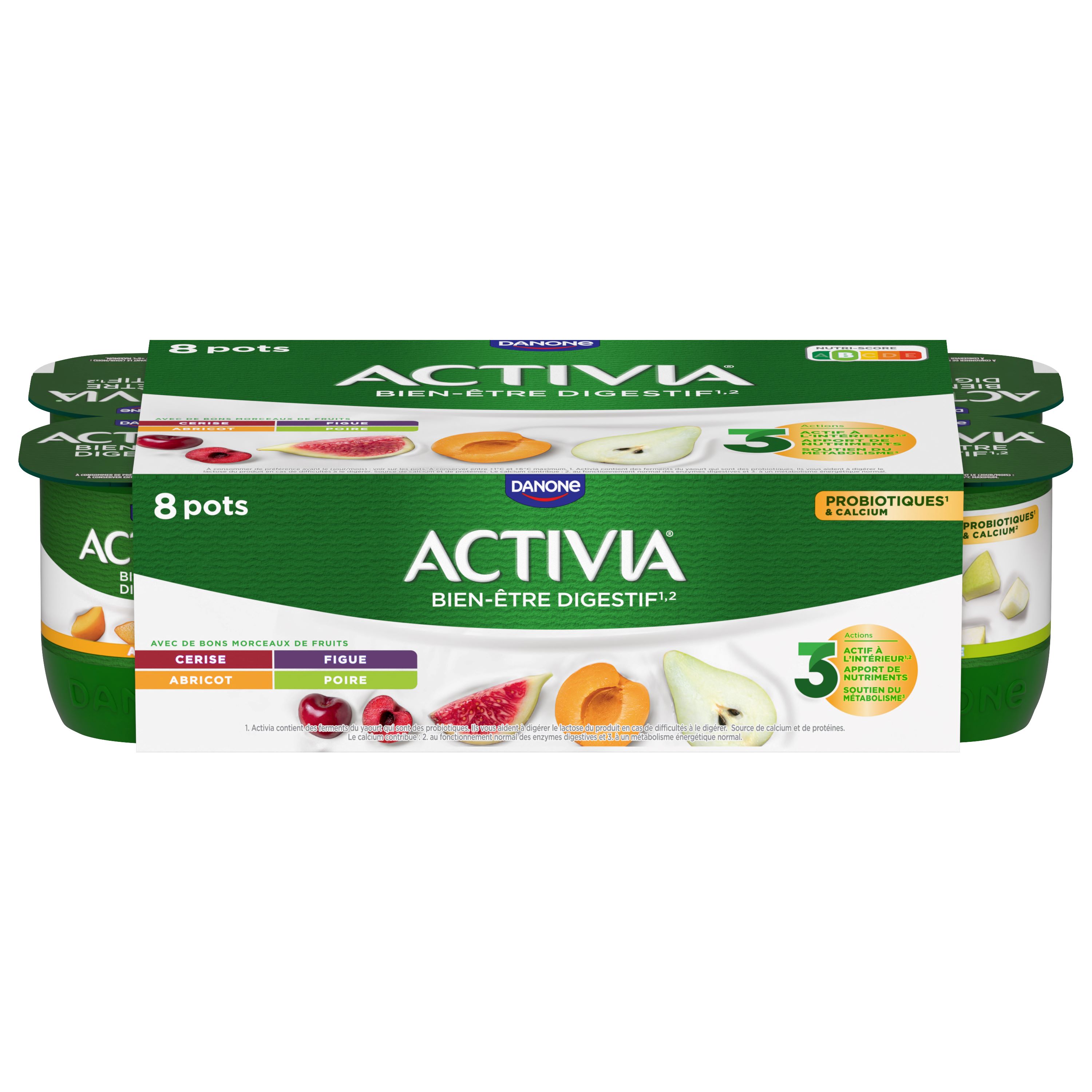 ACTIVIA yaourt aux fruits à l'abricot, à la poire, à la figue et à la cerise, c'est toute l'onctuosité d'ACTIVIA associée à de bons morceaux de fruits Cet Activia contient des ingrédients 100% d'origine naturelle, du bon lait entier français*, du bifidus et des milliards de ferments dont les probiotiques**. Un dessert conçu dans notre laiterie de Villecomtal-sur-Arros (32)! *Ajout de lait écrémé concentré ou en poudre (Origine: UE) **Activia contient les ferments du yaourt : les probiotiques. Ils vous aident à la digestion du lactose de votre Activia en cas de difficulté à le digérer.