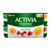 Activia fruits mixés fraise, framboise, mangue, abricot, c'est une recette aux fruits mixés sans morceaux. Cet Activia contient du bon lait entier français*, du bifidus et des milliards de ferments dont les probiotiques**. Ce dessert sans colorants*** et sans arômes artificiels est conçu dans notre laiterie de Villecomtal-sur-Arros (32). *Ajout de lait écrémé concentré ou en poudre (Origine: UE) **Activia contient les ferments du yaourt : les probiotiques. Ils vous aident à la digestion du lactose de votre Activia en cas de difficulté à le digérer. *** La couleur est apportée par des concentrés de fruits et de légumes.
