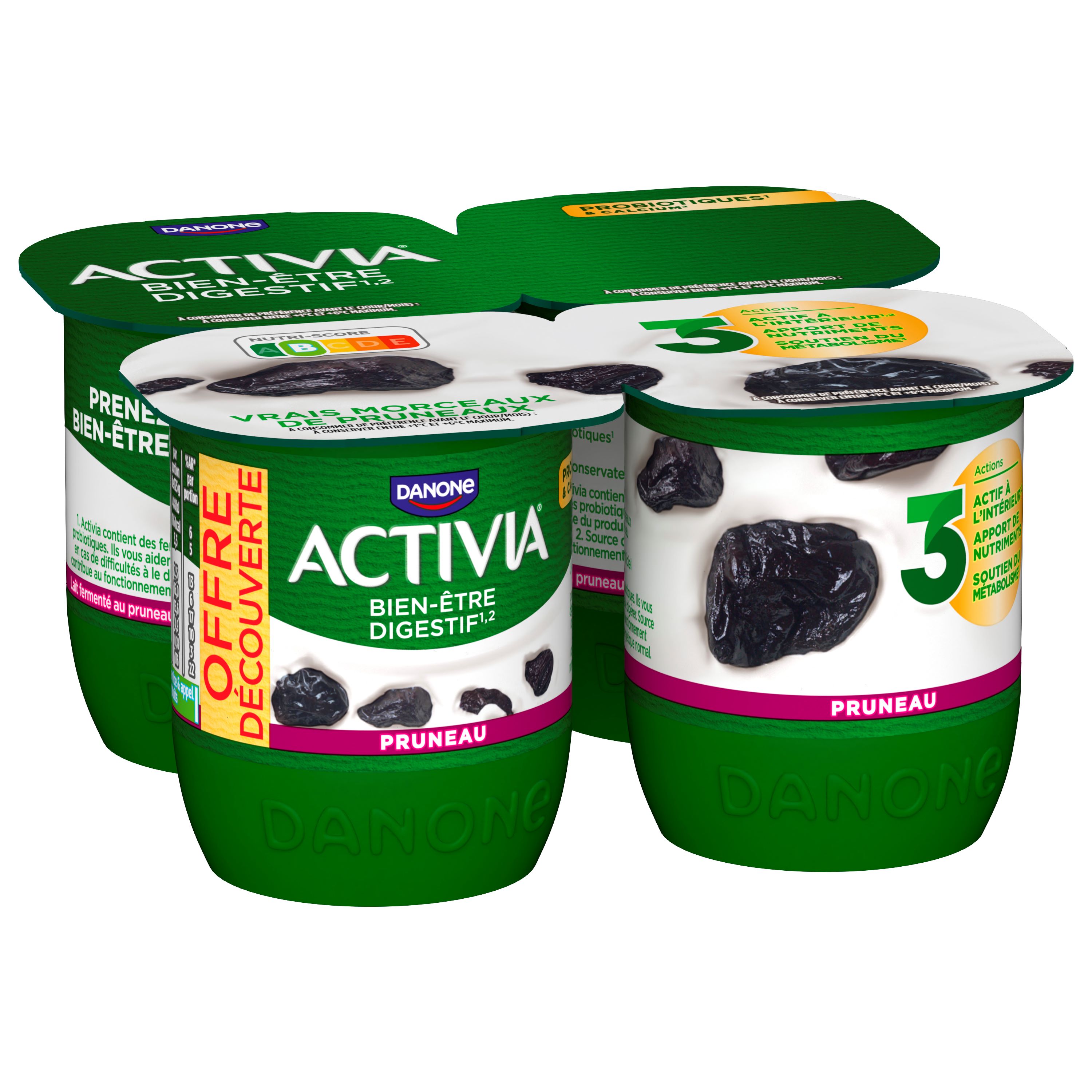 ACTIVIA yaourt aux fruits aux pruneau, c'est toute l'onctuosité d'ACTIVIA associée à de bons morceaux de pruneau. Cet Activia contient des ingrédients 100% d'origine naturelle, du bon lait entier français*, du bifidus et des milliards de ferments dont les probiotiques**. Une spécialité laitière conçue dans notre laiterie de Villecomtal-sur-Arros (32)! *Ajout de lait écrémé concentré ou en poudre (Origine: UE) **Activia contient les ferments du yaourt : les probiotiques. Ils vous aident à la digestion du lactose de votre Activia en cas de difficulté à le digérer.