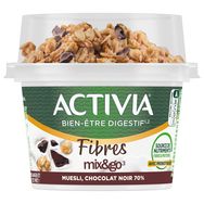 ACTIVIA Mix & Go* muesli chocolat noir, c'est l'onctuosité unique d'ACTIVIA associée au croquant de céréales. Cet Activia source de fibres est à base de bon lait et de 5 ferments dont des milliards de probiotiques*! .Une recette gourmande source de fibres qui contribue à votre apport quotidien recommandé en fibres**. A déguster chez vous au petit déjeuner, déjeuner ou dans la journée. Pratique à emporte grâce à sa cuillère en bois intégrée. *Activia contient les ferments du yaourt : les probiotiques. Ils vous aident à la digestion du lactose de votre Activia en cas de difficulté à le digérer ** Apport quotidien recommandé = 30g (ANSES 2016)