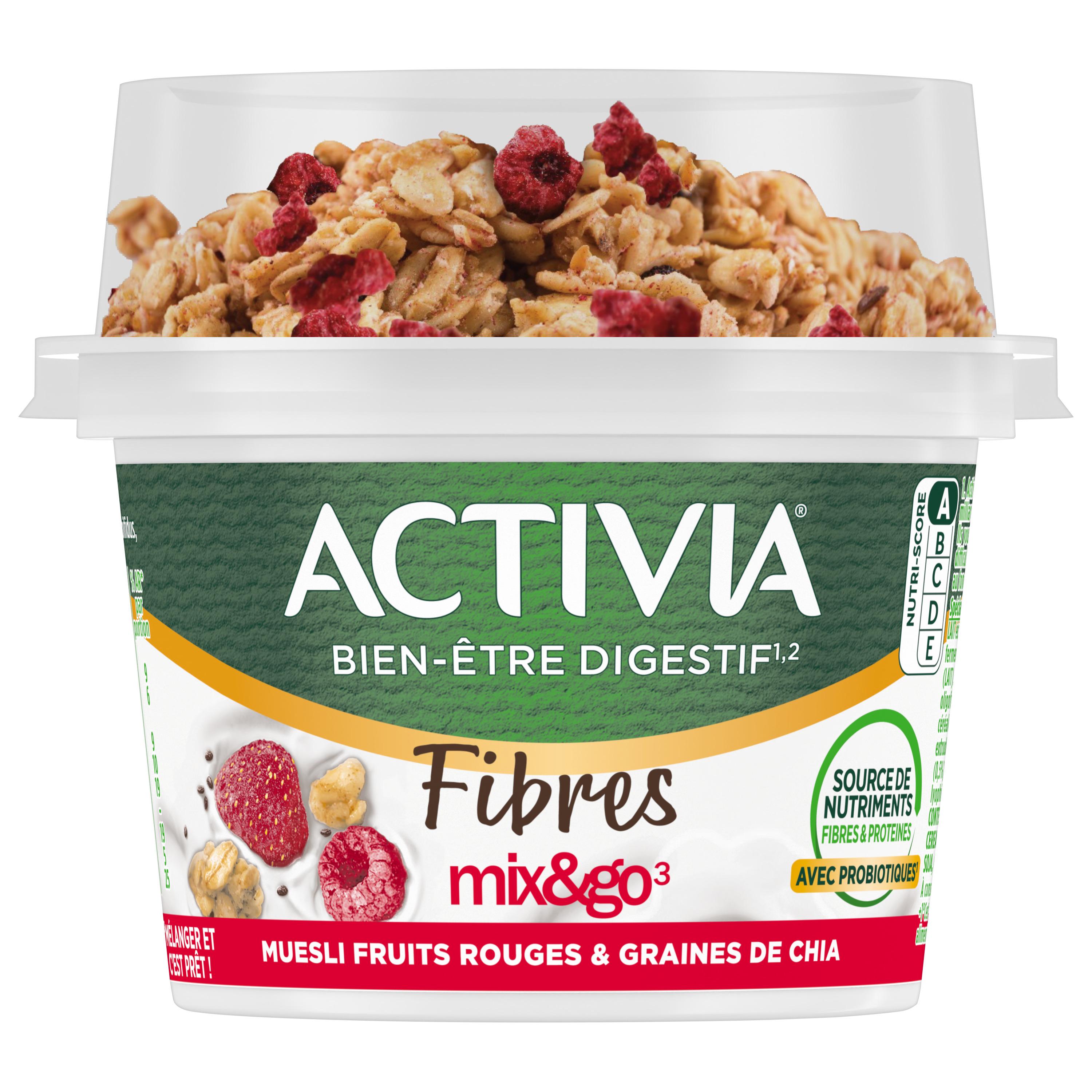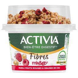 ACTIVIA Mix & Go* muesli, graines de chia et fruits rouges, c'est l'onctuosité unique d'ACTIVIA associée au croquant de céréales et au goût de fruits rouges. Cet Activia source de fibres est à base de bon lait et de 5 ferments dont des milliards de probiotiques*! .Une recette gourmande source de fibres qui contribue à votre apport quotidien recommandé en fibres**. A déguster chez vous au petit déjeuner, déjeuner ou dans la journée. Pratique à emporte grâce à sa cuillère en bois intégrée. *Activia contient les ferments du yaourt : les probiotiques. Ils vous aident à la digestion du lactose de votre Activia en cas de difficulté à le digérer ** Apport quotidien recommandé = 30g (ANSES 2016)