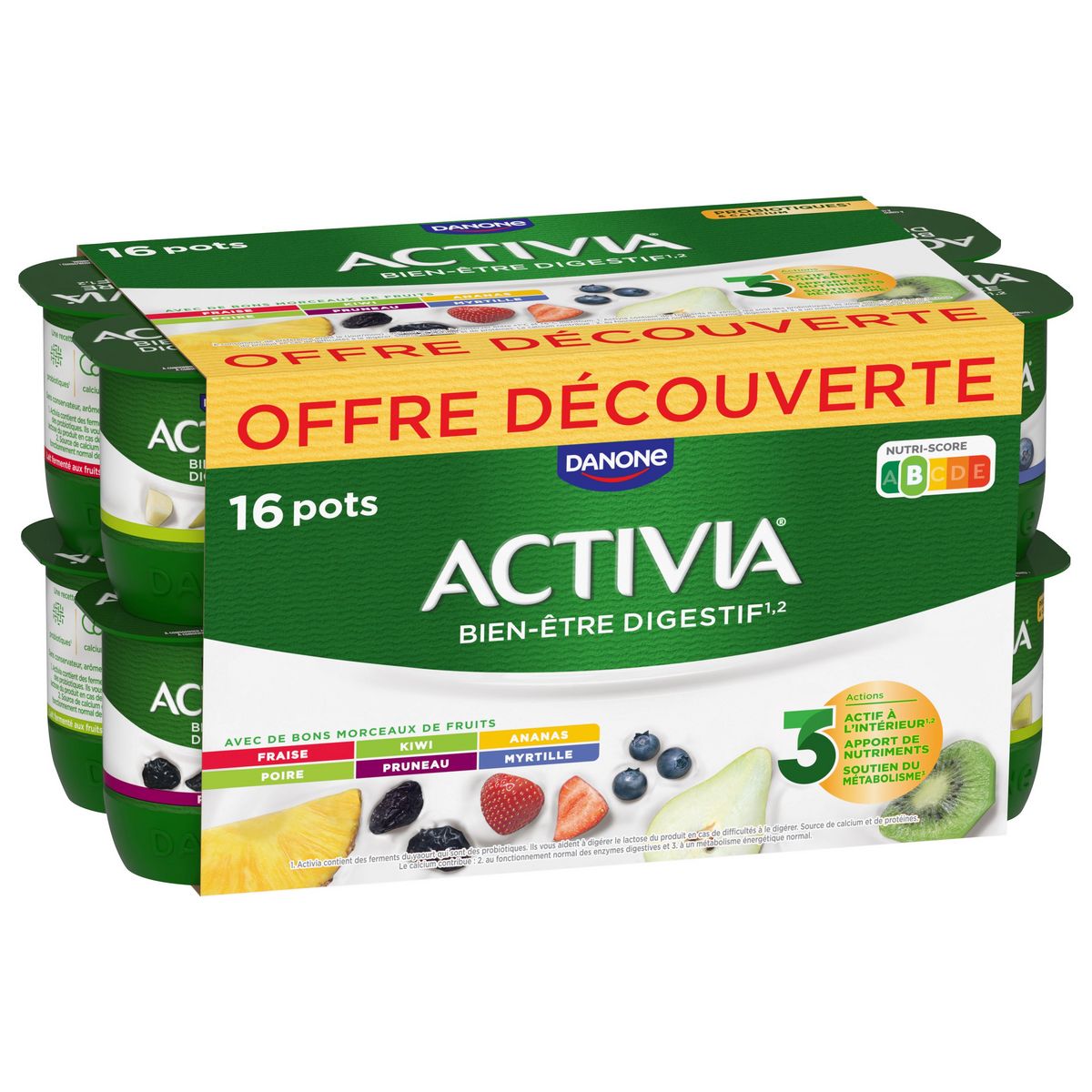 ACTIVIA yaourt aux fruits à la fraise, ananas, pruneau,kiwi,myrtille et poire, c'est toute l'onctuosité d'ACTIVIA associée à de bons morceaux de fruits Cet Activia contient des ingrédients 100% d'origine naturelle, du bon lait entier français*, du bifidus et des milliards de ferments dont les probiotiques**. Un dessert conçu dans notre laiterie de Villecomtal-sur-Arros (32)! *Ajout de lait écrémé concentré ou en poudre (Origine: UE) **Activia contient les ferments du yaourt : les probiotiques. Ils vous aident à la digestion du lactose de votre Activia en cas de difficulté à le digérer.